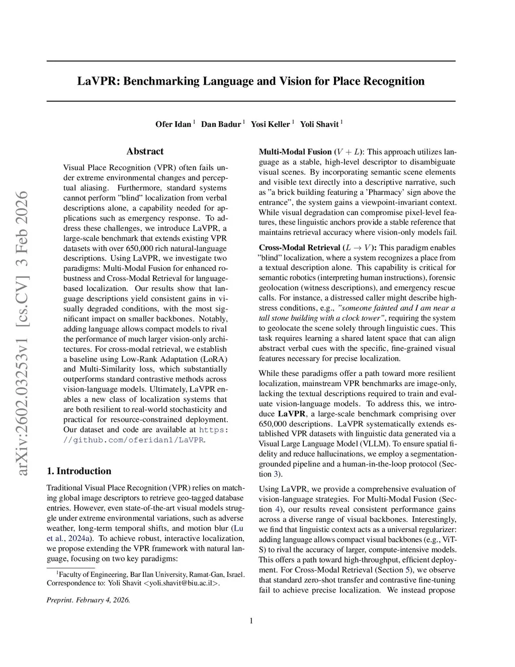 Visual Place Recognition (VPR) often fails under extreme environmental changes and perceptual aliasing. Furthermore, standard systems cannot perform "blind" localization from verbal descriptions alone, a capability needed for applications such as emergency response. To address these challenges, we introduce LaVPR, a large-scale benchmark that extends existing VPR datasets with over 650,000 rich natural-language descriptions. Using LaVPR, we investigate two paradigms: Multi-Modal Fusion for enhanced robustness and Cross-Modal Retrieval for language-based localization. Our results show that language descriptions yield consistent gains in visually degraded conditions, with the most significant impact on smaller backbones. Notably, adding language allows compact models to rival the performance of much larger vision-only architectures. For cross-modal retrieval, we establish a baseline using Low-Rank Adaptation (LoRA) and Multi-Similarity loss, which substantially outperforms standard contrastive methods across vision-language models. Ultimately, LaVPR enables a new class of localization systems that are both resilient to real-world stochasticity and practical for resource-constrained deployment. Our dataset and code are available atthis https URL.