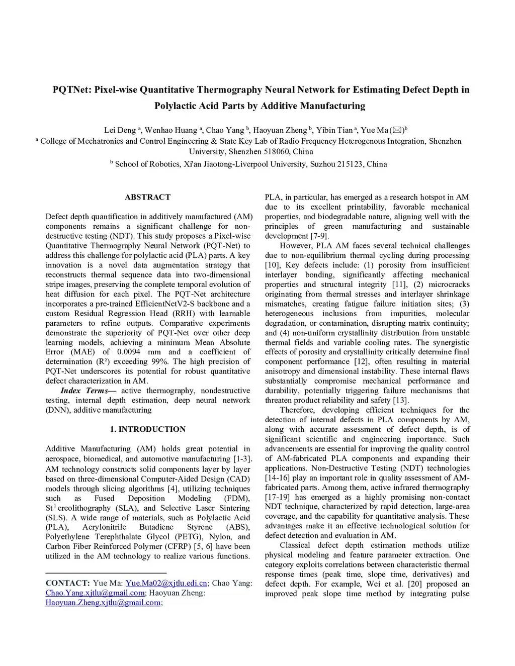 PQTNet: Pixel-wise Quantitative Thermography Neural Network for Estimating Defect Depth in Polylactic Acid Parts by Additive Manufacturing