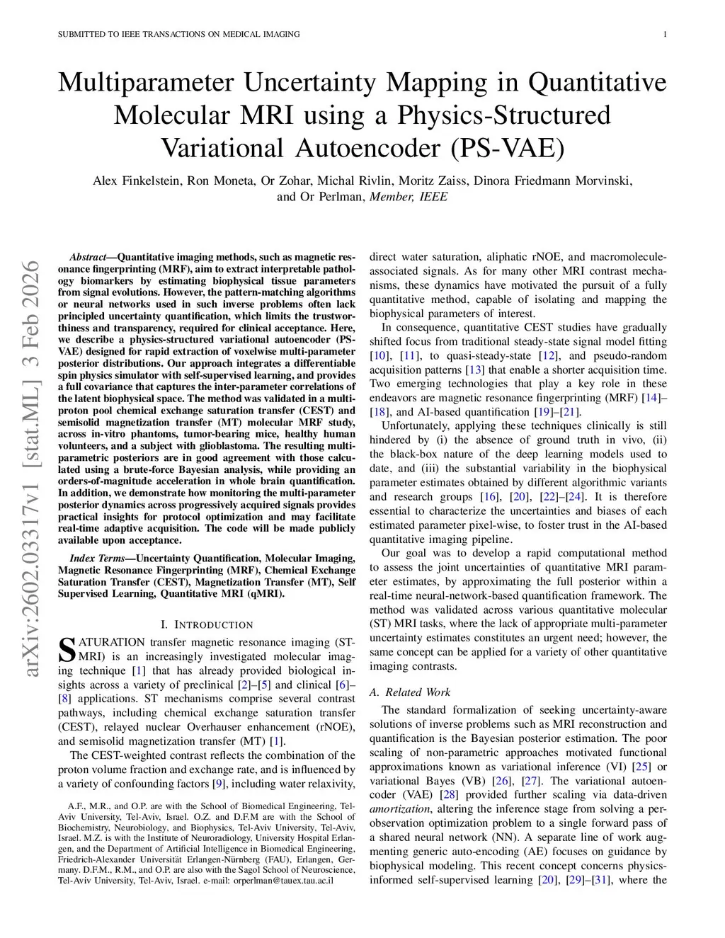Quantitative imaging methods, such as magnetic resonance fingerprinting (MRF), aim to extract interpretable pathology biomarkers by estimating biophysical tissue parameters from signal evolutions. However, the pattern-matching algorithms or neural networks used in such inverse problems often lack principled uncertainty quantification, which limits the trustworthiness and transparency, required for clinical acceptance. Here, we describe a physics-structured variational autoencoder (PS-VAE) designed for rapid extraction of voxelwise multi-parameter posterior distributions. Our approach integrates a differentiable spin physics simulator with self-supervised learning, and provides a full covariance that captures the inter-parameter correlations of the latent biophysical space. The method was validated in a multi-proton pool chemical exchange saturation transfer (CEST) and semisolid magnetization transfer (MT) molecular MRF study, across in-vitro phantoms, tumor-bearing mice, healthy human volunteers, and a subject with glioblastoma. The resulting multi-parametric posteriors are in good agreement with those calculated using a brute-force Bayesian analysis, while providing an orders-of-magnitude acceleration in whole brain quantification. In addition, we demonstrate how monitoring the multi-parameter posterior dynamics across progressively acquired signals provides practical insights for protocol optimization and may facilitate real-time adaptive acquisition.