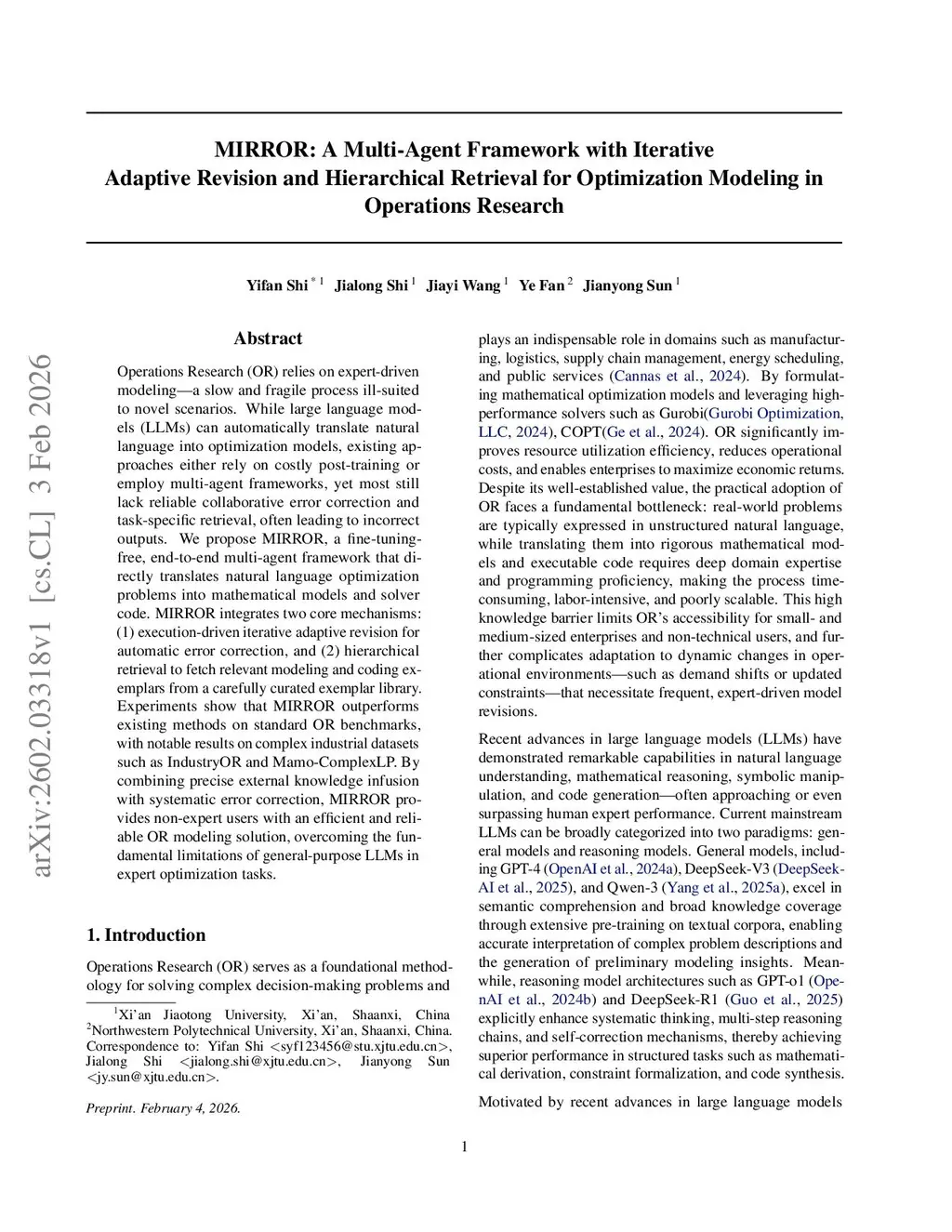 Operations Research (OR) relies on expert-driven modeling-a slow and fragile process ill-suited to novel scenarios. While large language models (LLMs) can automatically translate natural language into optimization models, existing approaches either rely on costly post-training or employ multi-agent frameworks, yet most still lack reliable collaborative error correction and task-specific retrieval, often leading to incorrect outputs. We propose MIRROR, a fine-tuning-free, end-to-end multi-agent framework that directly translates natural language optimization problems into mathematical models and solver code. MIRROR integrates two core mechanisms: (1) execution-driven iterative adaptive revision for automatic error correction, and (2) hierarchical retrieval to fetch relevant modeling and coding exemplars from a carefully curated exemplar library. Experiments show that MIRROR outperforms existing methods on standard OR benchmarks, with notable results on complex industrial datasets such as IndustryOR and Mamo-ComplexLP. By combining precise external knowledge infusion with systematic error correction, MIRROR provides non-expert users with an efficient and reliable OR modeling solution, overcoming the fundamental limitations of general-purpose LLMs in expert optimization tasks.