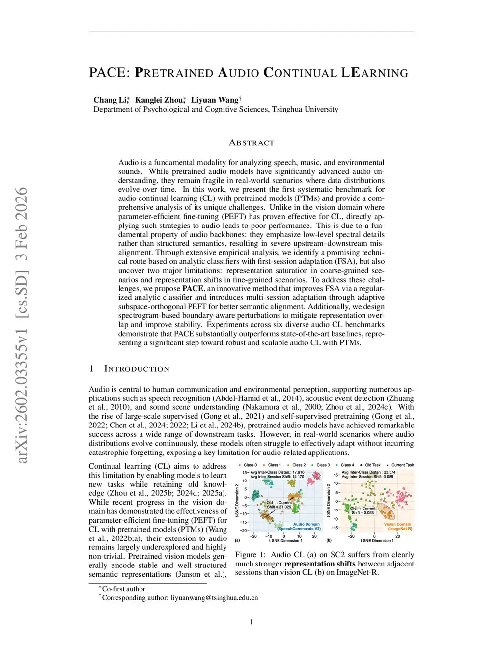 Audio is a fundamental modality for analyzing speech, music, and environmental sounds. Although pretrained audio models have significantly advanced audio understanding, they remain fragile in real-world settings where data distributions shift over time. In this work, we present the first systematic benchmark for audio continual learning (CL) with pretrained models (PTMs), together with a comprehensive analysis of its unique challenges. Unlike in vision, where parameter-efficient fine-tuning (PEFT) has proven effective for CL, directly transferring such strategies to audio leads to poor performance. This stems from a fundamental property of audio backbones: they focus on low-level spectral details rather than structured semantics, causing severe upstream-downstream misalignment. Through extensive empirical study, we identify analytic classifiers with first-session adaptation (FSA) as a promising direction, but also reveal two major limitations: representation saturation in coarse-grained scenarios and representation drift in fine-grained scenarios. To address these challenges, we propose PACE, a novel method that enhances FSA via a regularized analytic classifier and enables multi-session adaptation through adaptive subspace-orthogonal PEFT for improved semantic alignment. In addition, we introduce spectrogram-based boundary-aware perturbations to mitigate representation overlap and improve stability. Experiments on six diverse audio CL benchmarks demonstrate that PACE substantially outperforms state-of-the-art baselines, marking an important step toward robust and scalable audio continual learning with PTMs.