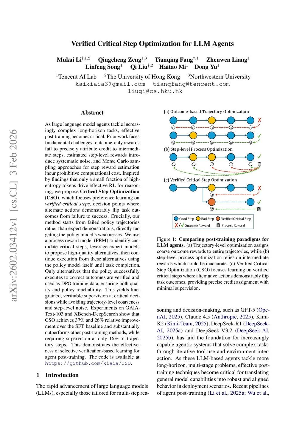 As large language model agents tackle increasingly complex long-horizon tasks, effective post-training becomes critical. Prior work faces fundamental challenges: outcome-only rewards fail to precisely attribute credit to intermediate steps, estimated step-level rewards introduce systematic noise, and Monte Carlo sampling approaches for step reward estimation incur prohibitive computational cost. Inspired by findings that only a small fraction of high-entropy tokens drive effective RL for reasoning, we propose Critical Step Optimization (CSO), which focuses preference learning on verified critical steps, decision points where alternate actions demonstrably flip task outcomes from failure to success. Crucially, our method starts from failed policy trajectories rather than expert demonstrations, directly targeting the policy model's weaknesses. We use a process reward model (PRM) to identify candidate critical steps, leverage expert models to propose high-quality alternatives, then continue execution from these alternatives using the policy model itself until task completion. Only alternatives that the policy successfully executes to correct outcomes are verified and used as DPO training data, ensuring both quality and policy reachability. This yields fine-grained, verifiable supervision at critical decisions while avoiding trajectory-level coarseness and step-level noise. Experiments on GAIA-Text-103 and XBench-DeepSearch show that CSO achieves 37% and 26% relative improvement over the SFT baseline and substantially outperforms other post-training methods, while requiring supervision at only 16% of trajectory steps. This demonstrates the effectiveness of selective verification-based learning for agent post-training.