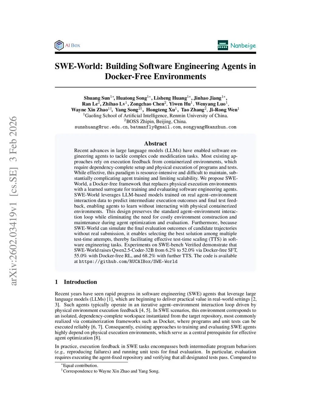 Recent advances in large language models (LLMs) have enabled software engineering agents to tackle complex code modification tasks. Most existing approaches rely on execution feedback from containerized environments, which require dependency-complete setup and physical execution of programs and tests. While effective, this paradigm is resource-intensive and difficult to maintain, substantially complicating agent training and limiting scalability. We propose SWE-World, a Docker-free framework that replaces physical execution environments with a learned surrogate for training and evaluating software engineering agents. SWE-World leverages LLM-based models trained on real agent-environment interaction data to predict intermediate execution outcomes and final test feedback, enabling agents to learn without interacting with physical containerized environments. This design preserves the standard agent-environment interaction loop while eliminating the need for costly environment construction and maintenance during agent optimization and evaluation. Furthermore, because SWE-World can simulate the final evaluation outcomes of candidate trajectories without real submission, it enables selecting the best solution among multiple test-time attempts, thereby facilitating effective test-time scaling (TTS) in software engineering tasks. Experiments on SWE-bench Verified demonstrate that SWE-World raises Qwen2.5-Coder-32B from 6.2\% to 52.0\% via Docker-free SFT, 55.0\% with Docker-free RL, and 68.2\% with further TTS. The code is available atthis https URL