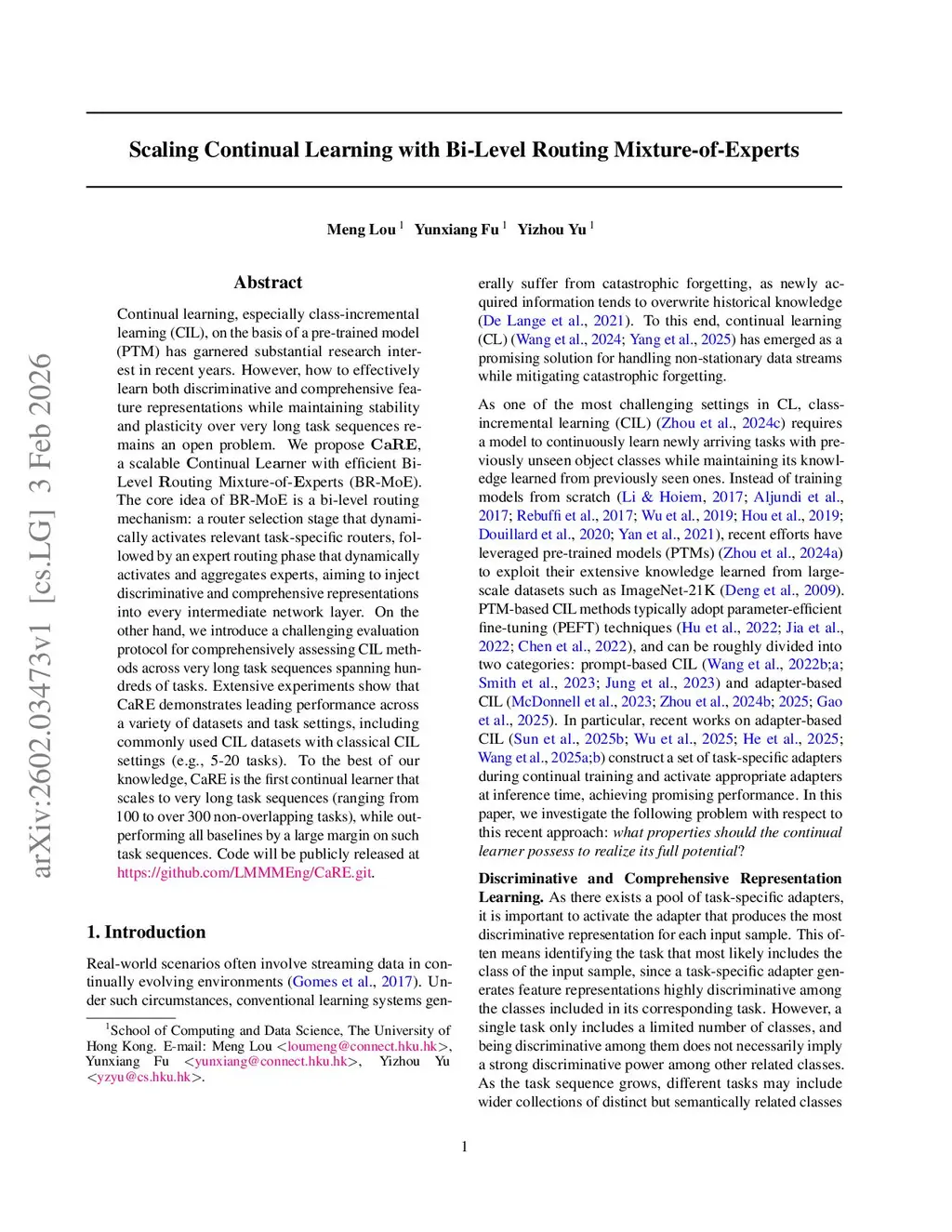 Continual learning, especially class-incremental learning (CIL), on the basis of a pre-trained model (PTM) has garnered substantial research interest in recent years. However, how to effectively learn both discriminative and comprehensive feature representations while maintaining stability and plasticity over very long task sequences remains an open problem. We propose CaRE, a scalable {C}ontinual Le{a}rner with efficient Bi-Level {R}outing Mixture-of-{E}xperts (BR-MoE). The core idea of BR-MoE is a bi-level routing mechanism: a router selection stage that dynamically activates relevant task-specific routers, followed by an expert routing phase that dynamically activates and aggregates experts, aiming to inject discriminative and comprehensive representations into every intermediate network layer. On the other hand, we introduce a challenging evaluation protocol for comprehensively assessing CIL methods across very long task sequences spanning hundreds of tasks. Extensive experiments show that CaRE demonstrates leading performance across a variety of datasets and task settings, including commonly used CIL datasets with classical CIL settings (e.g., 5-20 tasks). To the best of our knowledge, CaRE is the first continual learner that scales to very long task sequences (ranging from 100 to over 300 non-overlapping tasks), while outperforming all baselines by a large margin on such task sequences. Code will be publicly released atthis https URL.