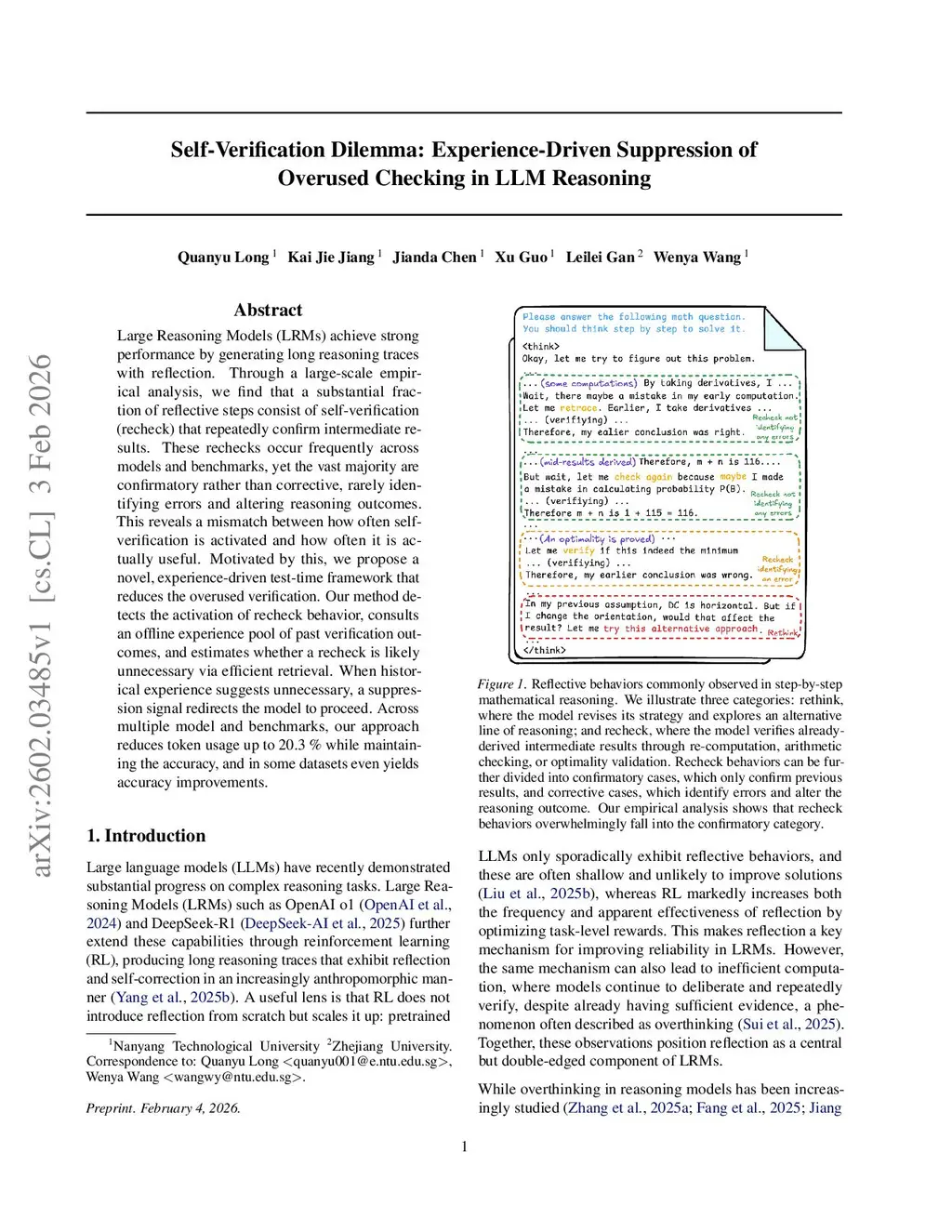 Large Reasoning Models (LRMs) achieve strong performance by generating long reasoning traces with reflection. Through a large-scale empirical analysis, we find that a substantial fraction of reflective steps consist of self-verification (recheck) that repeatedly confirm intermediate results. These rechecks occur frequently across models and benchmarks, yet the vast majority are confirmatory rather than corrective, rarely identifying errors and altering reasoning outcomes. This reveals a mismatch between how often self-verification is activated and how often it is actually useful. Motivated by this, we propose a novel, experience-driven test-time framework that reduces the overused verification. Our method detects the activation of recheck behavior, consults an offline experience pool of past verification outcomes, and estimates whether a recheck is likely unnecessary via efficient retrieval. When historical experience suggests unnecessary, a suppression signal redirects the model to proceed. Across multiple model and benchmarks, our approach reduces token usage up to 20.3% while maintaining the accuracy, and in some datasets even yields accuracy improvements.