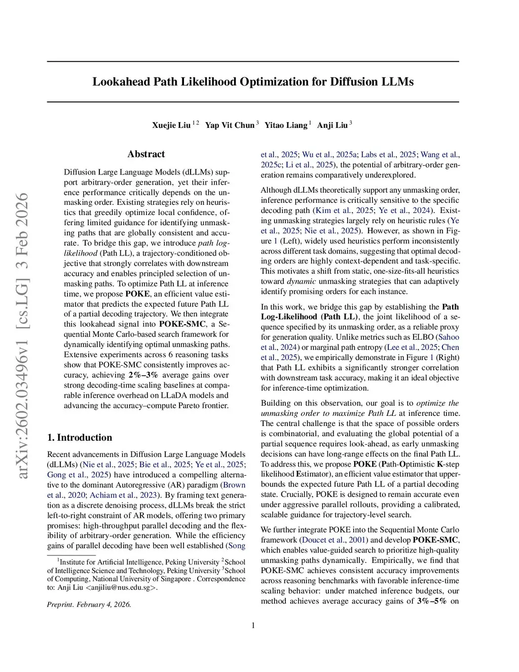 Diffusion Large Language Models (dLLMs) support arbitrary-order generation, yet their inference performance critically depends on the unmasking order. Existing strategies rely on heuristics that greedily optimize local confidence, offering limited guidance for identifying unmasking paths that are globally consistent and accurate. To bridge this gap, we introduce path log-likelihood (Path LL), a trajectory-conditioned objective that strongly correlates with downstream accuracy and enables principled selection of unmasking paths. To optimize Path LL at inference time, we propose POKE, an efficient value estimator that predicts the expected future Path LL of a partial decoding trajectory. We then integrate this lookahead signal into POKE-SMC, a Sequential Monte Carlo-based search framework for dynamically identifying optimal unmasking paths. Extensive experiments across 6 reasoning tasks show that POKE-SMC consistently improves accuracy, achieving 2%--3% average gains over strong decoding-time scaling baselines at comparable inference overhead on LLaDA models and advancing the accuracy--compute Pareto frontier.