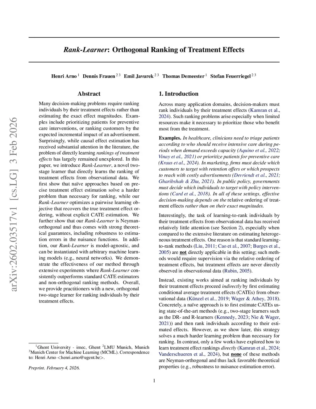 Many decision-making problems require ranking individuals by their treatment effects rather than estimating the exact effect magnitudes. Examples include prioritizing patients for preventive care interventions, or ranking customers by the expected incremental impact of an advertisement. Surprisingly, while causal effect estimation has received substantial attention in the literature, the problem of directly learning rankings of treatment effects has largely remained unexplored. In this paper, we introduce Rank-Learner, a novel two-stage learner that directly learns the ranking of treatment effects from observational data. We first show that naive approaches based on precise treatment effect estimation solve a harder problem than necessary for ranking, while our Rank-Learner optimizes a pairwise learning objective that recovers the true treatment effect ordering, without explicit CATE estimation. We further show that our Rank-Learner is Neyman-orthogonal and thus comes with strong theoretical guarantees, including robustness to estimation errors in the nuisance functions. In addition, our Rank-Learner is model-agnostic, and can be instantiated with arbitrary machine learning models (e.g., neural networks). We demonstrate the effectiveness of our method through extensive experiments where Rank-Learner consistently outperforms standard CATE estimators and non-orthogonal ranking methods. Overall, we provide practitioners with a new, orthogonal two-stage learner for ranking individuals by their treatment effects.