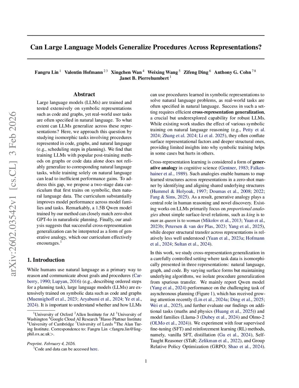 Large language models (LLMs) are trained and tested extensively on symbolic representations such as code and graphs, yet real-world user tasks are often specified in natural language. To what extent can LLMs generalize across these representations? Here, we approach this question by studying isomorphic tasks involving procedures represented in code, graphs, and natural language (e.g., scheduling steps in planning). We find that training LLMs with popular post-training methods on graphs or code data alone does not reliably generalize to corresponding natural language tasks, while training solely on natural language can lead to inefficient performance gains. To address this gap, we propose a two-stage data curriculum that first trains on symbolic, then natural language data. The curriculum substantially improves model performance across model families and tasks. Remarkably, a 1.5B Qwen model trained by our method can closely match zero-shot GPT-4o in naturalistic planning. Finally, our analysis suggests that successful cross-representation generalization can be interpreted as a form of generative analogy, which our curriculum effectively encourages.
