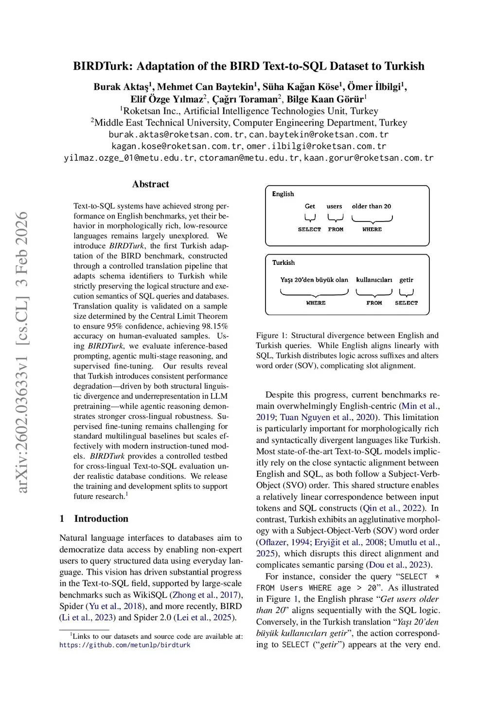 Text-to-SQL systems have achieved strong performance on English benchmarks, yet their behavior in morphologically rich, low-resource languages remains largely unexplored. We introduce BIRDTurk, the first Turkish adaptation of the BIRD benchmark, constructed through a controlled translation pipeline that adapts schema identifiers to Turkish while strictly preserving the logical structure and execution semantics of SQL queries and databases. Translation quality is validated on a sample size determined by the Central Limit Theorem to ensure 95% confidence, achieving 98.15% accuracy on human-evaluated samples. Using BIRDTurk, we evaluate inference-based prompting, agentic multi-stage reasoning, and supervised fine-tuning. Our results reveal that Turkish introduces consistent performance degradation, driven by both structural linguistic divergence and underrepresentation in LLM pretraining, while agentic reasoning demonstrates stronger cross-lingual robustness. Supervised fine-tuning remains challenging for standard multilingual baselines but scales effectively with modern instruction-tuned models. BIRDTurk provides a controlled testbed for cross-lingual Text-to-SQL evaluation under realistic database conditions. We release the training and development splits to support future research.