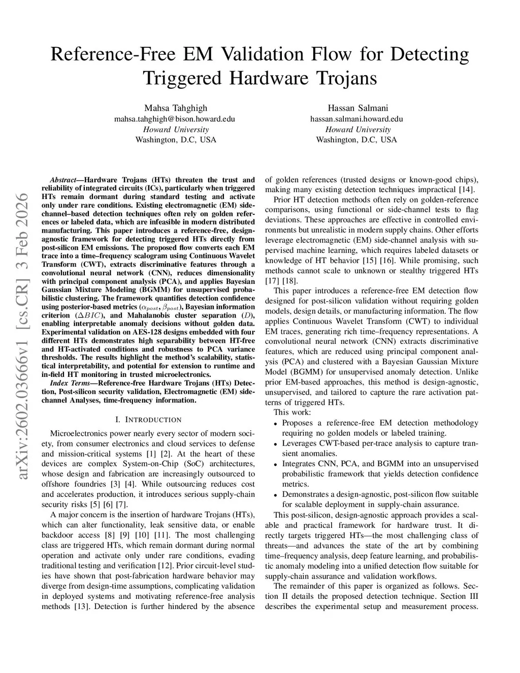 Hardware Trojans (HTs) threaten the trust and reliability of integrated circuits (ICs), particularly when triggered HTs remain dormant during standard testing and activate only under rare conditions. Existing electromagnetic (EM) side-channel-based detection techniques often rely on golden references or labeled data, which are infeasible in modern distributed manufacturing. This paper introduces a reference-free, design-agnostic framework for detecting triggered HTs directly from post-silicon EM emissions. The proposed flow converts each EM trace into a time-frequency scalogram using Continuous Wavelet Transform (CWT), extracts discriminative features through a convolutional neural network (CNN), reduces dimensionality with principal component analysis (PCA), and applies Bayesian Gaussian Mixture Modeling (BGMM) for unsupervised probabilistic clustering. The framework quantifies detection confidence using posterior-based metrics (alpha_{post}, beta_{post}), Bayesian information criterion (Delta BIC), and Mahalanobis cluster separation (D), enabling interpretable anomaly decisions without golden data. Experimental validation on AES-128 designs embedded with four different HTs demonstrates high separability between HT-free and HT-activated conditions and robustness to PCA variance thresholds. The results highlight the method's scalability, statistical interpretability, and potential for extension to runtime and in-field HT monitoring in trusted microelectronics.