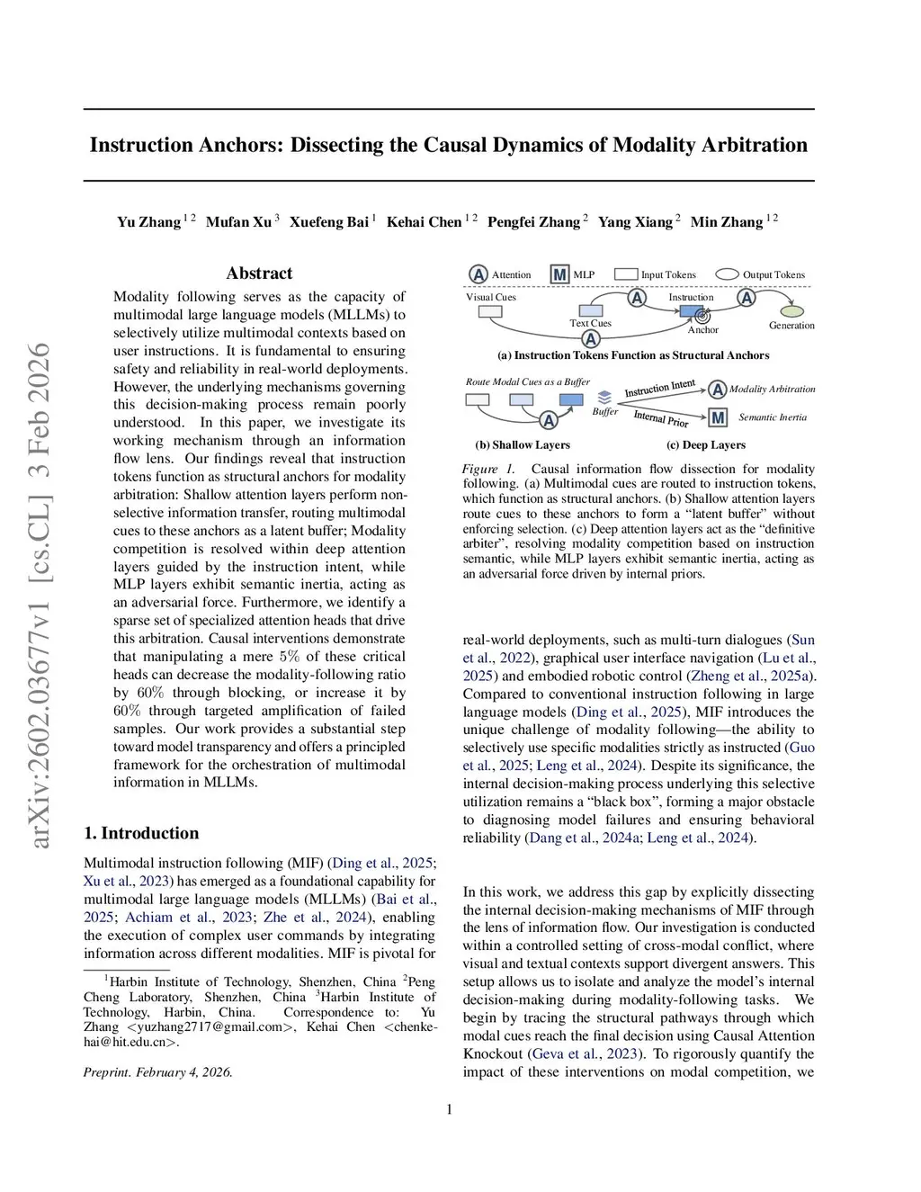Modality following serves as the capacity of multimodal large language models (MLLMs) to selectively utilize multimodal contexts based on user instructions. It is fundamental to ensuring safety and reliability in real-world deployments. However, the underlying mechanisms governing this decision-making process remain poorly understood. In this paper, we investigate its working mechanism through an information flow lens. Our findings reveal that instruction tokens function as structural anchors for modality arbitration: Shallow attention layers perform non-selective information transfer, routing multimodal cues to these anchors as a latent buffer; Modality competition is resolved within deep attention layers guided by the instruction intent, while MLP layers exhibit semantic inertia, acting as an adversarial force. Furthermore, we identify a sparse set of specialized attention heads that drive this arbitration. Causal interventions demonstrate that manipulating a mere of these critical heads can decrease the modality-following ratio by through blocking, or increase it by through targeted amplification of failed samples. Our work provides a substantial step toward model transparency and offers a principled framework for the orchestration of multimodal information in MLLMs.