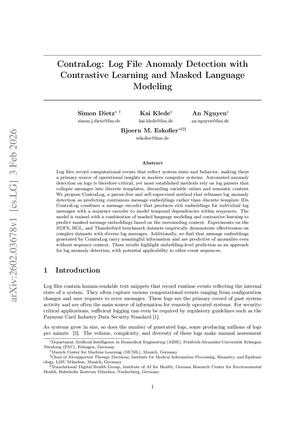 ContraLog: Log File Anomaly Detection with Contrastive Learning and Masked Language Modeling