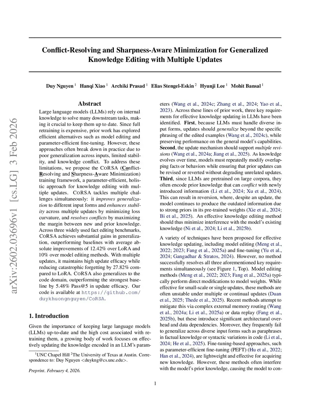 Large language models (LLMs) rely on internal knowledge to solve many downstream tasks, making it crucial to keep them up to date. Since full retraining is expensive, prior work has explored efficient alternatives such as model editing and parameter-efficient fine-tuning. However, these approaches often break down in practice due to poor generalization across inputs, limited stability, and knowledge conflict. To address these limitations, we propose the CoRSA (Conflict-Resolving and Sharpness-Aware Minimization) training framework, a parameter-efficient, holistic approach for knowledge editing with multiple updates. CoRSA tackles multiple challenges simultaneously: it improves generalization to different input forms and enhances stability across multiple updates by minimizing loss curvature, and resolves conflicts by maximizing the margin between new and prior knowledge. Across three widely used fact editing benchmarks, CoRSA achieves significant gains in generalization, outperforming baselines with average absolute improvements of 12.42% over LoRA and 10% over model editing methods. With multiple updates, it maintains high update efficacy while reducing catastrophic forgetting by 27.82% compared to LoRA. CoRSA also generalizes to the code domain, outperforming the strongest baseline by 5.48% Pass@5 in update efficacy.