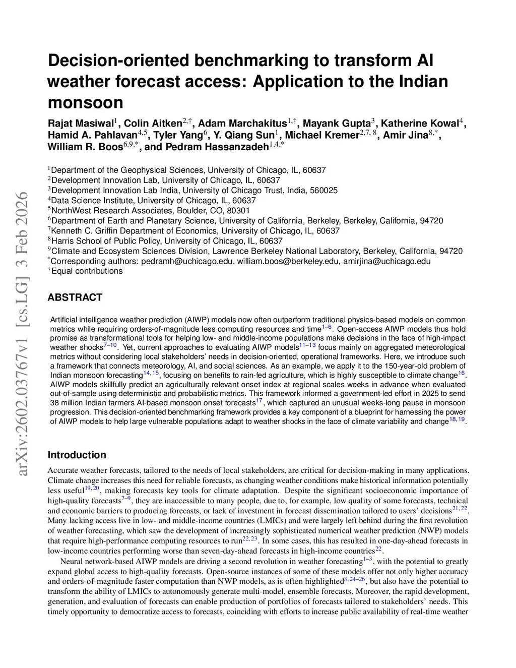 Artificial intelligence weather prediction (AIWP) models now often outperform traditional physics-based models on common metrics while requiring orders-of-magnitude less computing resources and time. Open-access AIWP models thus hold promise as transformational tools for helping low- and middle-income populations make decisions in the face of high-impact weather shocks. Yet, current approaches to evaluating AIWP models focus mainly on aggregated meteorological metrics without considering local stakeholders' needs in decision-oriented, operational frameworks. Here, we introduce such a framework that connects meteorology, AI, and social sciences. As an example, we apply it to the 150-year-old problem of Indian monsoon forecasting, focusing on benefits to rain-fed agriculture, which is highly susceptible to climate change. AIWP models skillfully predict an agriculturally relevant onset index at regional scales weeks in advance when evaluated out-of-sample using deterministic and probabilistic metrics. This framework informed a government-led effort in 2025 to send 38 million Indian farmers AI-based monsoon onset forecasts, which captured an unusual weeks-long pause in monsoon progression. This decision-oriented benchmarking framework provides a key component of a blueprint for harnessing the power of AIWP models to help large vulnerable populations adapt to weather shocks in the face of climate variability and change.