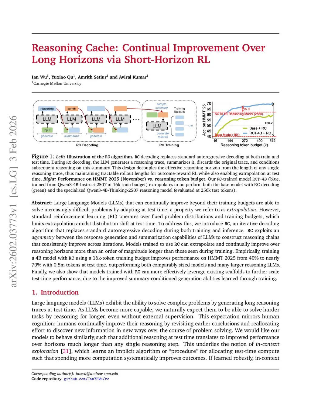 Reasoning Cache: Continual Improvement Over Long Horizons via Short-Horizon RL