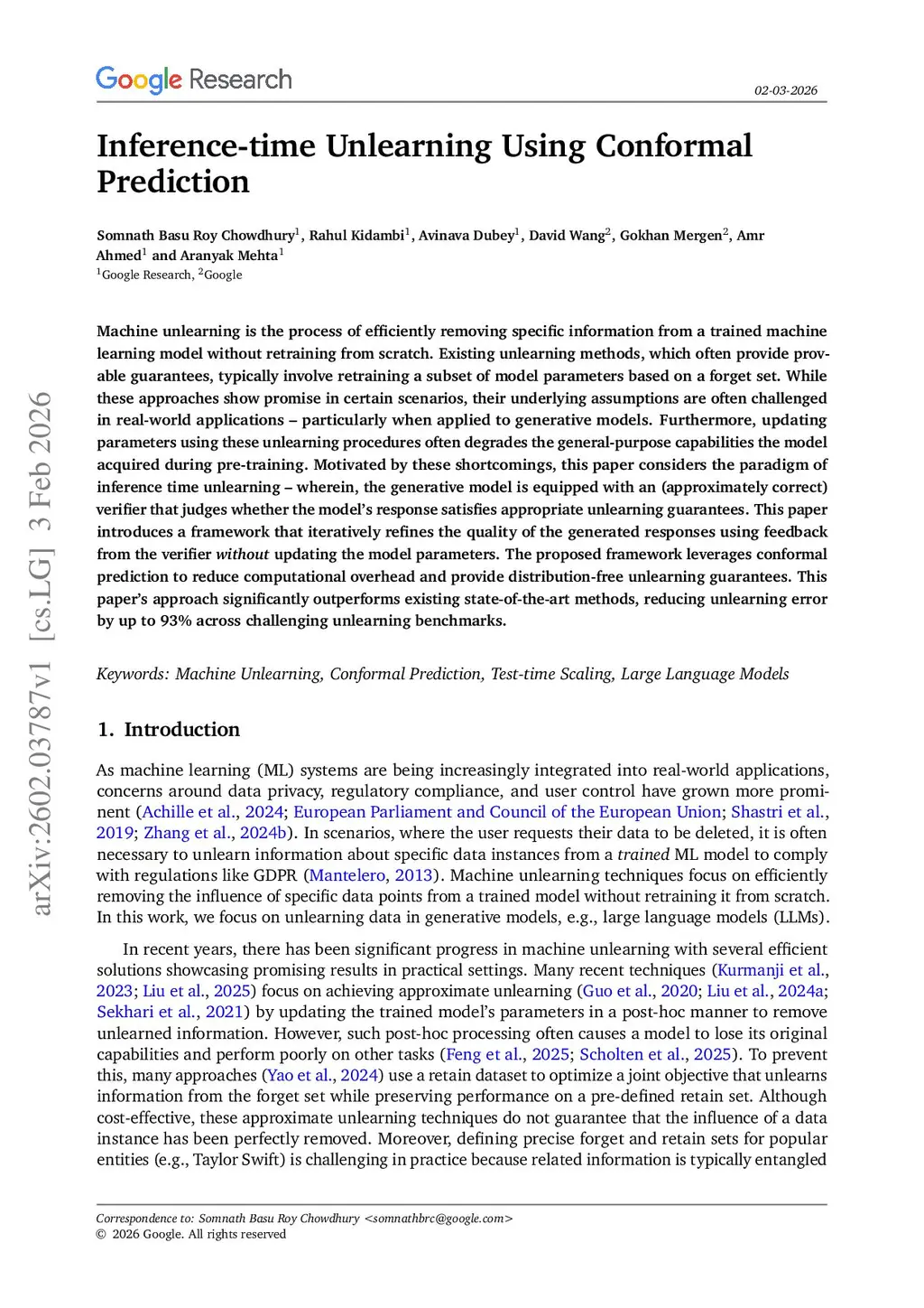 Machine unlearning is the process of efficiently removing specific information from a trained machine learning model without retraining from scratch. Existing unlearning methods, which often provide provable guarantees, typically involve retraining a subset of model parameters based on a forget set. While these approaches show promise in certain scenarios, their underlying assumptions are often challenged in real-world applications -- particularly when applied to generative models. Furthermore, updating parameters using these unlearning procedures often degrades the general-purpose capabilities the model acquired during pre-training. Motivated by these shortcomings, this paper considers the paradigm of inference time unlearning -- wherein, the generative model is equipped with an (approximately correct) verifier that judges whether the model's response satisfies appropriate unlearning guarantees. This paper introduces a framework that iteratively refines the quality of the generated responses using feedback from the verifier without updating the model parameters. The proposed framework leverages conformal prediction to reduce computational overhead and provide distribution-free unlearning guarantees. This paper's approach significantly outperforms existing state-of-the-art methods, reducing unlearning error by up to 93% across challenging unlearning benchmarks.
