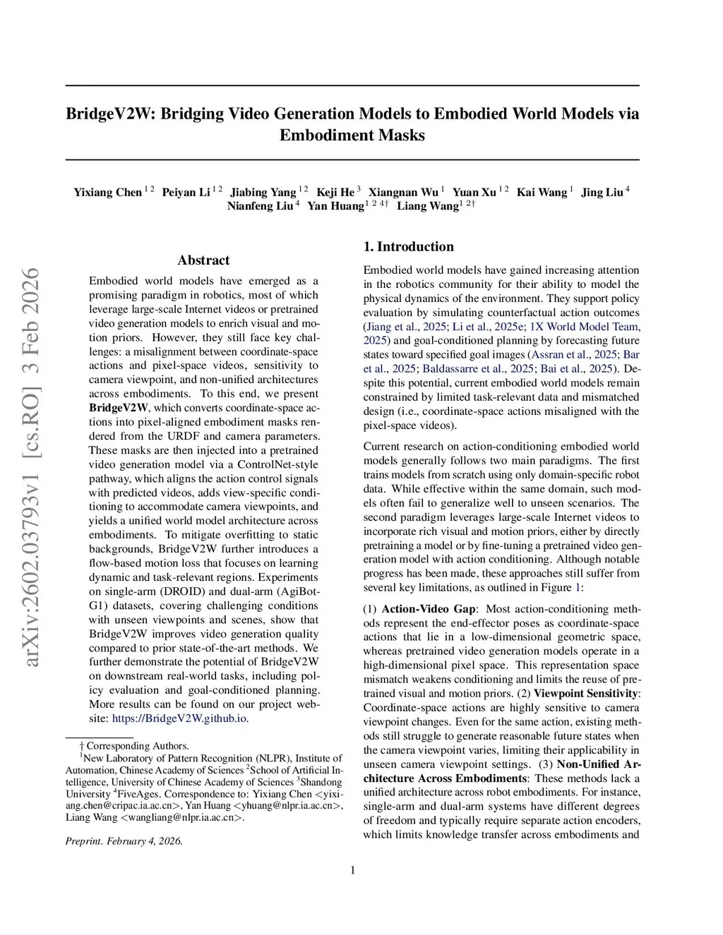 Embodied world models have emerged as a promising paradigm in robotics, most of which leverage large-scale Internet videos or pretrained video generation models to enrich visual and motion priors. However, they still face key challenges: a misalignment between coordinate-space actions and pixel-space videos, sensitivity to camera viewpoint, and non-unified architectures across embodiments. To this end, we present BridgeV2W, which converts coordinate-space actions into pixel-aligned embodiment masks rendered from the URDF and camera parameters. These masks are then injected into a pretrained video generation model via a ControlNet-style pathway, which aligns the action control signals with predicted videos, adds view-specific conditioning to accommodate camera viewpoints, and yields a unified world model architecture across embodiments. To mitigate overfitting to static backgrounds, BridgeV2W further introduces a flow-based motion loss that focuses on learning dynamic and task-relevant regions. Experiments on single-arm (DROID) and dual-arm (AgiBot-G1) datasets, covering diverse and challenging conditions with unseen viewpoints and scenes, show that BridgeV2W improves video generation quality compared to prior state-of-the-art methods. We further demonstrate the potential of BridgeV2W on downstream real-world tasks, including policy evaluation and goal-conditioned planning. More results can be found on our project website atthis https URL.