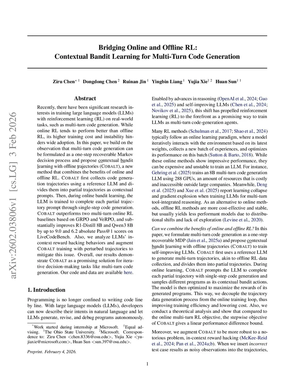 Bridging Online and Offline RL: Contextual Bandit Learning for Multi-Turn Code Generation