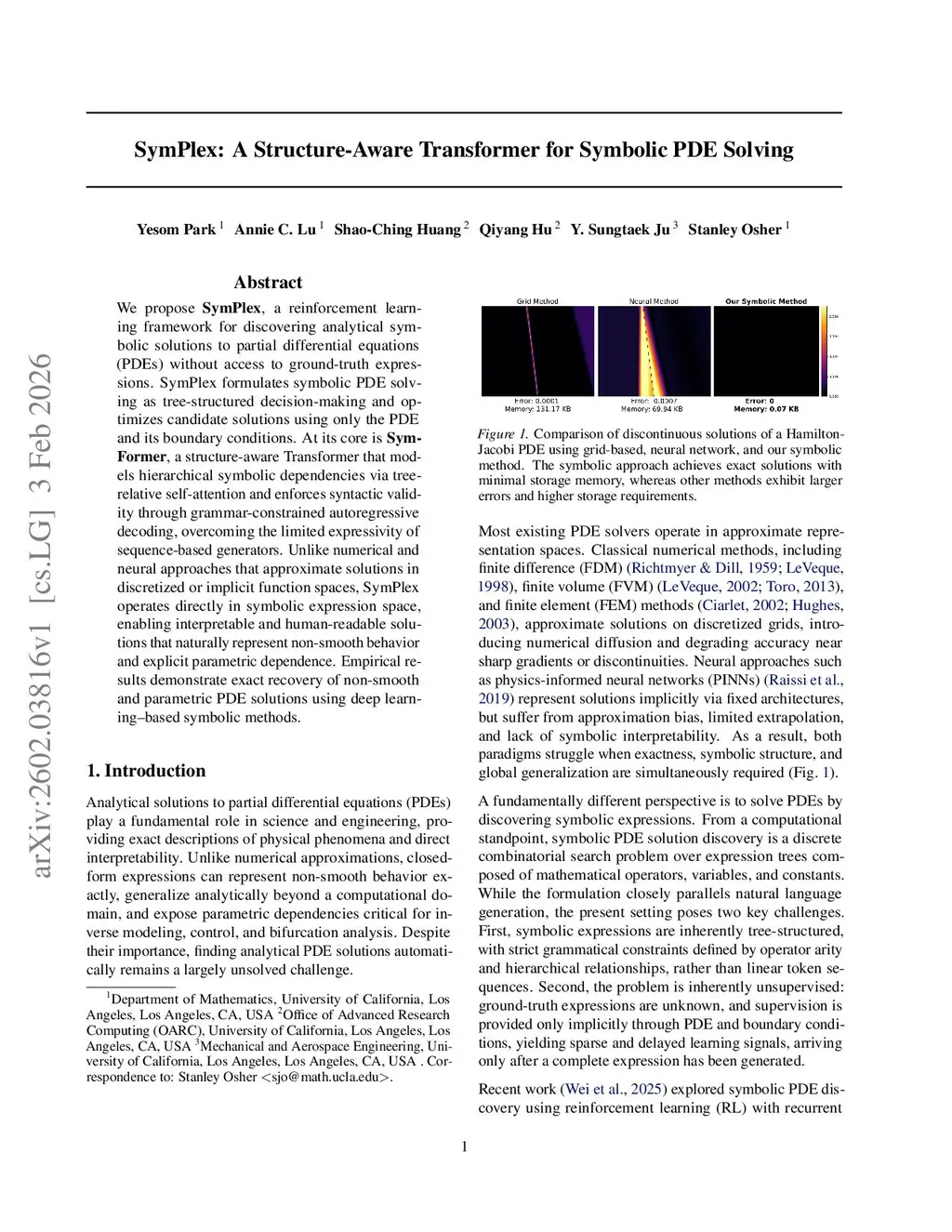 We propose SymPlex, a reinforcement learning framework for discovering analytical symbolic solutions to partial differential equations (PDEs) without access to ground-truth expressions. SymPlex formulates symbolic PDE solving as tree-structured decision-making and optimizes candidate solutions using only the PDE and its boundary conditions. At its core is SymFormer, a structure-aware Transformer that models hierarchical symbolic dependencies via tree-relative self-attention and enforces syntactic validity through grammar-constrained autoregressive decoding, overcoming the limited expressivity of sequence-based generators. Unlike numerical and neural approaches that approximate solutions in discretized or implicit function spaces, SymPlex operates directly in symbolic expression space, enabling interpretable and human-readable solutions that naturally represent non-smooth behavior and explicit parametric dependence. Empirical results demonstrate exact recovery of non-smooth and parametric PDE solutions using deep learning-based symbolic methods.