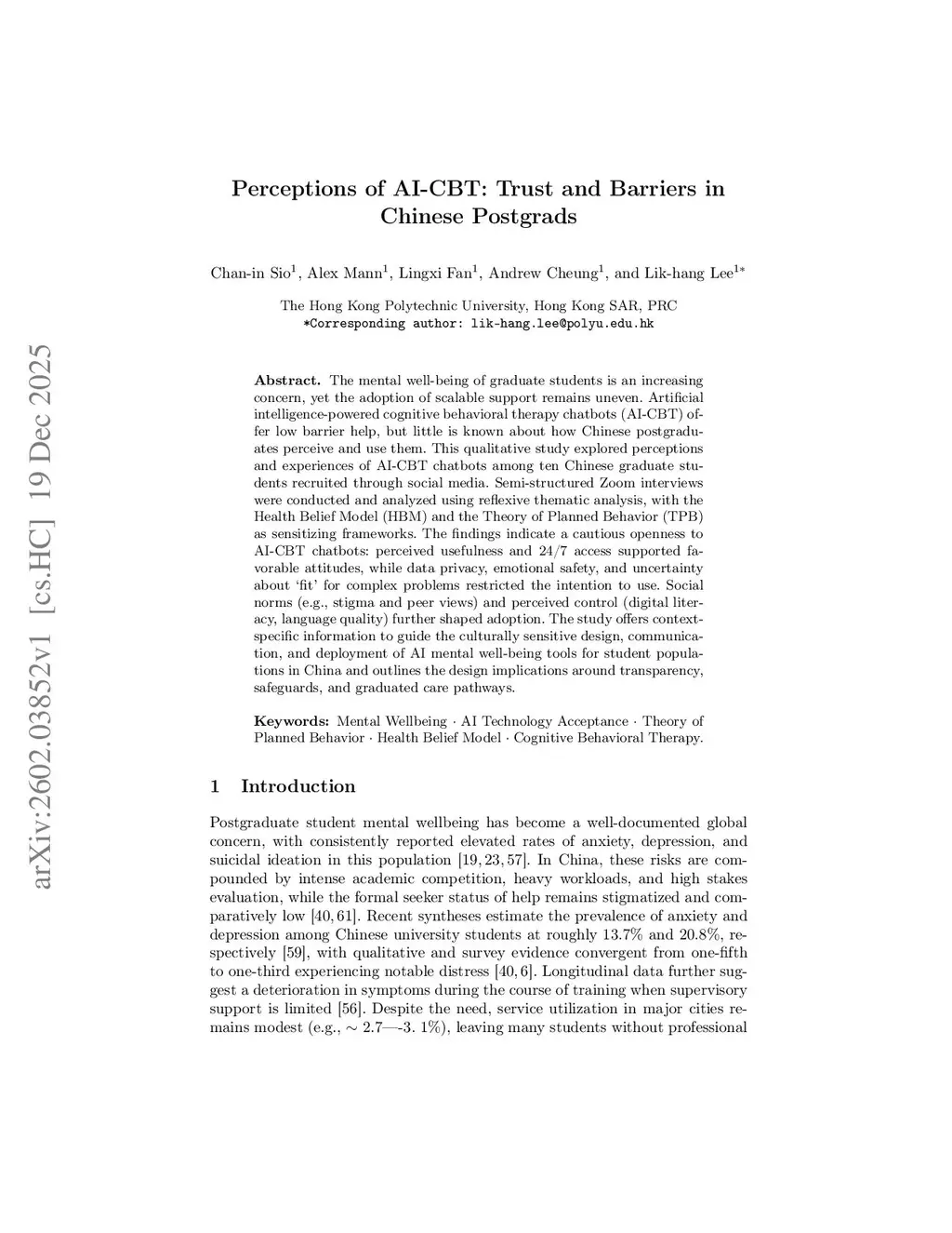Perceptions of AI-CBT: Trust and Barriers in Chinese Postgrads