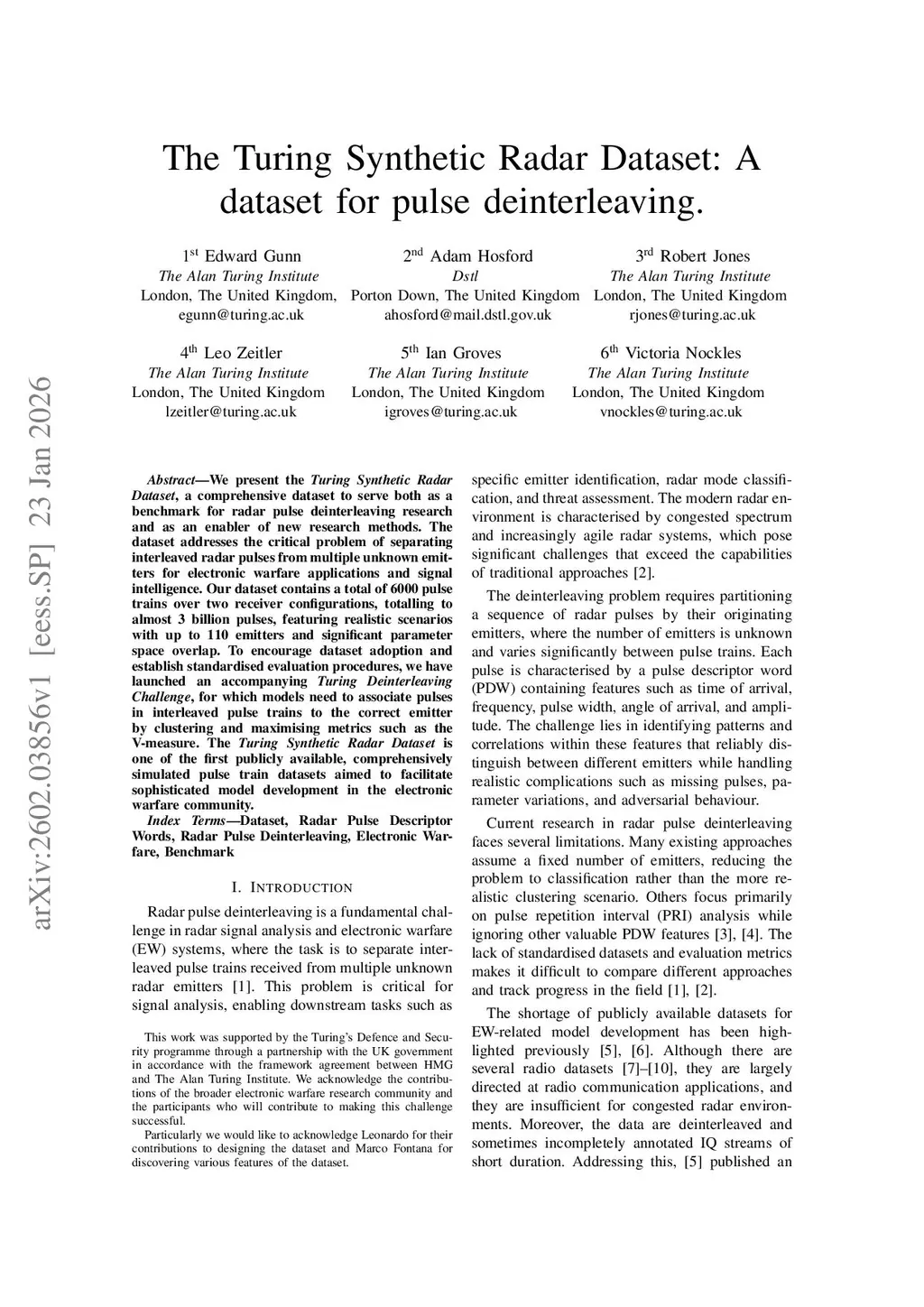 We present the Turing Synthetic Radar Dataset, a comprehensive dataset to serve both as a benchmark for radar pulse deinterleaving research and as an enabler of new research methods. The dataset addresses the critical problem of separating interleaved radar pulses from multiple unknown emitters for electronic warfare applications and signal intelligence. Our dataset contains a total of 6000 pulse trains over two receiver configurations, totalling to almost 3 billion pulses, featuring realistic scenarios with up to 110 emitters and significant parameter space overlap. To encourage dataset adoption and establish standardised evaluation procedures, we have launched an accompanying Turing Deinterleaving Challenge, for which models need to associate pulses in interleaved pulse trains to the correct emitter by clustering and maximising metrics such as the V-measure. The Turing Synthetic Radar Dataset is one of the first publicly available, comprehensively simulated pulse train datasets aimed to facilitate sophisticated model development in the electronic warfare community