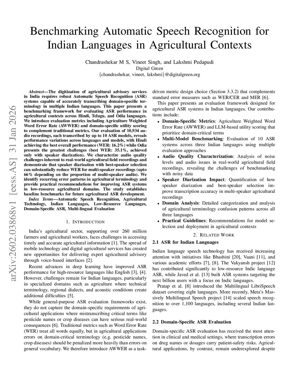 The digitization of agricultural advisory services in India requires robust Automatic Speech Recognition (ASR) systems capable of accurately transcribing domain-specific terminology in multiple Indian languages. This paper presents a benchmarking framework for evaluating ASR performance in agricultural contexts across Hindi, Telugu, and Odia languages. We introduce evaluation metrics including Agriculture Weighted Word Error Rate (AWWER) and domain-specific utility scoring to complement traditional metrics. Our evaluation of 10,934 audio recordings, each transcribed by up to 10 ASR models, reveals performance variations across languages and models, with Hindi achieving the best overall performance (WER: 16.2%) while Odia presents the greatest challenges (best WER: 35.1%, achieved only with speaker diarization). We characterize audio quality challenges inherent to real-world agricultural field recordings and demonstrate that speaker diarization with best-speaker selection can substantially reduce WER for multi-speaker recordings (upto 66% depending on the proportion of multi-speaker audio). We identify recurring error patterns in agricultural terminology and provide practical recommendations for improving ASR systems in low-resource agricultural domains. The study establishes baseline benchmarks for future agricultural ASR development.