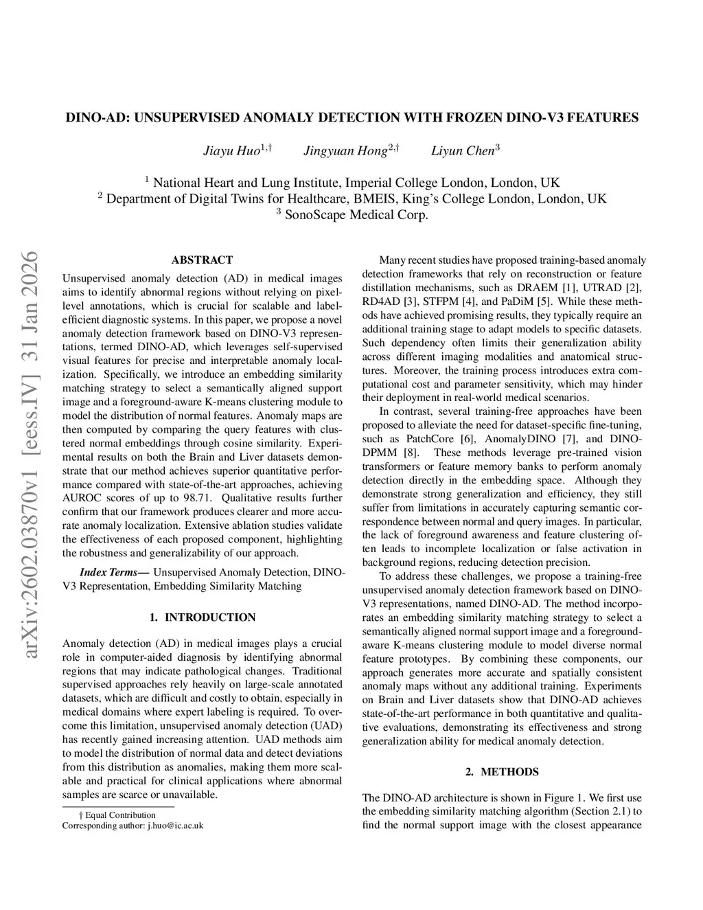 Unsupervised anomaly detection (AD) in medical images aims to identify abnormal regions without relying on pixel-level annotations, which is crucial for scalable and label-efficient diagnostic systems. In this paper, we propose a novel anomaly detection framework based on DINO-V3 representations, termed DINO-AD, which leverages self-supervised visual features for precise and interpretable anomaly localization. Specifically, we introduce an embedding similarity matching strategy to select a semantically aligned support image and a foreground-aware K-means clustering module to model the distribution of normal features. Anomaly maps are then computed by comparing the query features with clustered normal embeddings through cosine similarity. Experimental results on both the Brain and Liver datasets demonstrate that our method achieves superior quantitative performance compared with state-of-the-art approaches, achieving AUROC scores of up to 98.71. Qualitative results further confirm that our framework produces clearer and more accurate anomaly localization. Extensive ablation studies validate the effectiveness of each proposed component, highlighting the robustness and generalizability of our approach.