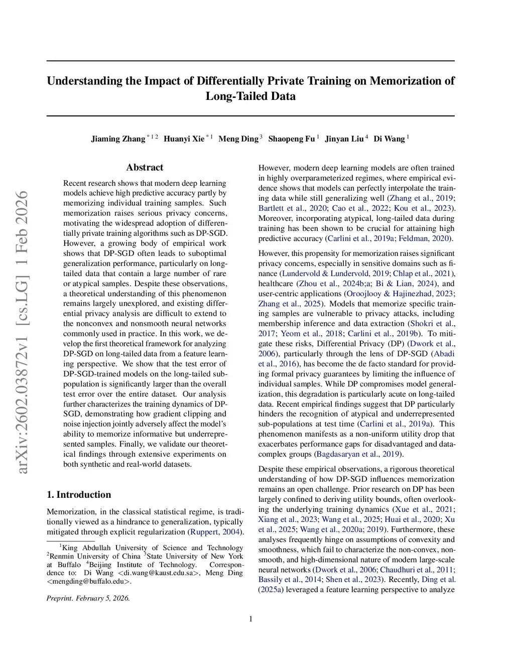 Recent research shows that modern deep learning models achieve high predictive accuracy partly by memorizing individual training samples. Such memorization raises serious privacy concerns, motivating the widespread adoption of differentially private training algorithms such as DP-SGD. However, a growing body of empirical work shows that DP-SGD often leads to suboptimal generalization performance, particularly on long-tailed data that contain a large number of rare or atypical samples. Despite these observations, a theoretical understanding of this phenomenon remains largely unexplored, and existing differential privacy analysis are difficult to extend to the nonconvex and nonsmooth neural networks commonly used in practice. In this work, we develop the first theoretical framework for analyzing DP-SGD on long-tailed data from a feature learning perspective. We show that the test error of DP-SGD-trained models on the long-tailed subpopulation is significantly larger than the overall test error over the entire dataset. Our analysis further characterizes the training dynamics of DP-SGD, demonstrating how gradient clipping and noise injection jointly adversely affect the model's ability to memorize informative but underrepresented samples. Finally, we validate our theoretical findings through extensive experiments on both synthetic and real-world datasets.