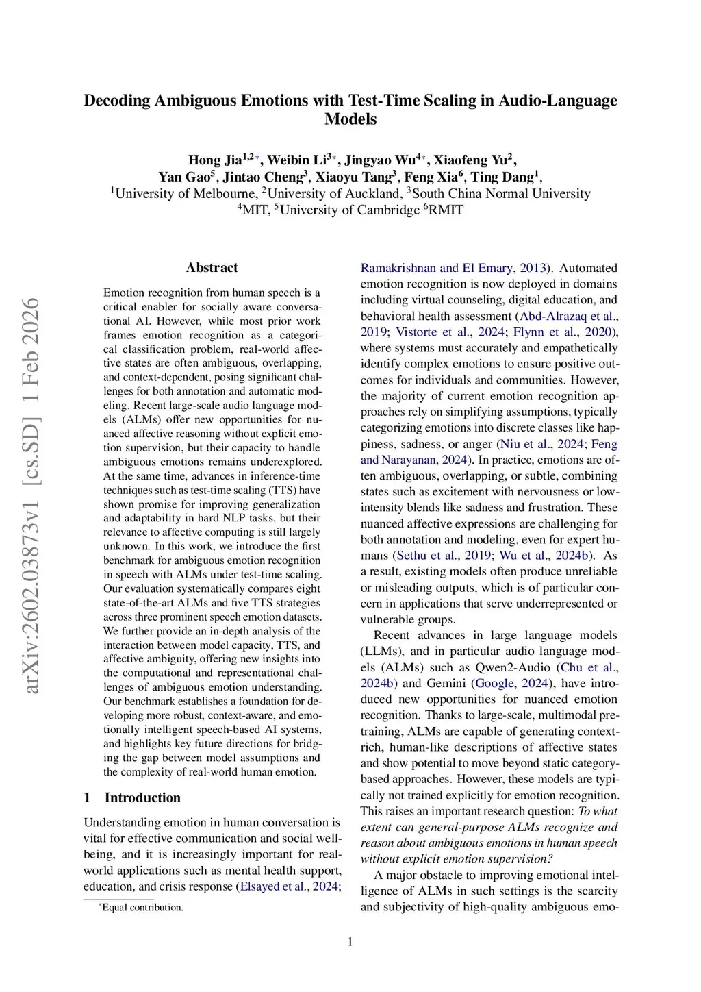Emotion recognition from human speech is a critical enabler for socially aware conversational AI. However, while most prior work frames emotion recognition as a categorical classification problem, real-world affective states are often ambiguous, overlapping, and context-dependent, posing significant challenges for both annotation and automatic modeling. Recent large-scale audio language models (ALMs) offer new opportunities for nuanced affective reasoning without explicit emotion supervision, but their capacity to handle ambiguous emotions remains underexplored. At the same time, advances in inference-time techniques such as test-time scaling (TTS) have shown promise for improving generalization and adaptability in hard NLP tasks, but their relevance to affective computing is still largely unknown. In this work, we introduce the first benchmark for ambiguous emotion recognition in speech with ALMs under test-time scaling. Our evaluation systematically compares eight state-of-the-art ALMs and five TTS strategies across three prominent speech emotion datasets. We further provide an in-depth analysis of the interaction between model capacity, TTS, and affective ambiguity, offering new insights into the computational and representational challenges of ambiguous emotion understanding. Our benchmark establishes a foundation for developing more robust, context-aware, and emotionally intelligent speech-based AI systems, and highlights key future directions for bridging the gap between model assumptions and the complexity of real-world human emotion.