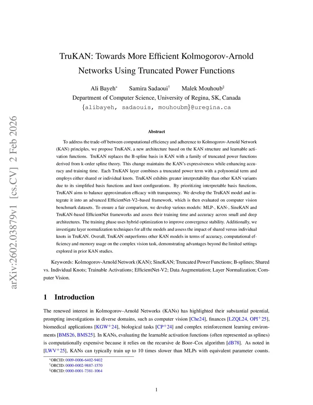 To address the trade-off between computational efficiency and adherence to Kolmogorov-Arnold Network (KAN) principles, we propose TruKAN, a new architecture based on the KAN structure and learnable activation functions. TruKAN replaces the B-spline basis in KAN with a family of truncated power functions derived from k-order spline theory. This change maintains the KAN's expressiveness while enhancing accuracy and training time. Each TruKAN layer combines a truncated power term with a polynomial term and employs either shared or individual knots. TruKAN exhibits greater interpretability than other KAN variants due to its simplified basis functions and knot configurations. By prioritizing interpretable basis functions, TruKAN aims to balance approximation efficacy with transparency. We develop the TruKAN model and integrate it into an advanced EfficientNet-V2-based framework, which is then evaluated on computer vision benchmark datasets. To ensure a fair comparison, we develop various models: MLP-, KAN-, SineKAN and TruKAN-based EfficientNet frameworks and assess their training time and accuracy across small and deep architectures. The training phase uses hybrid optimization to improve convergence stability. Additionally, we investigate layer normalization techniques for all the models and assess the impact of shared versus individual knots in TruKAN. Overall, TruKAN outperforms other KAN models in terms of accuracy, computational efficiency and memory usage on the complex vision task, demonstrating advantages beyond the limited settings explored in prior KAN studies.
