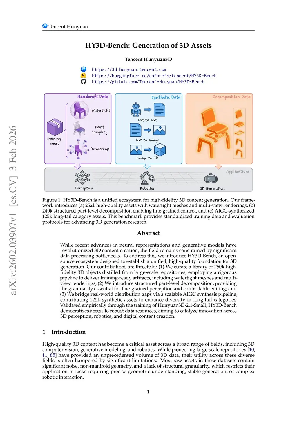 While recent advances in neural representations and generative models have revolutionized 3D content creation, the field remains constrained by significant data processing bottlenecks. To address this, we introduce HY3D-Bench, an open-source ecosystem designed to establish a unified, high-quality foundation for 3D generation. Our contributions are threefold: (1) We curate a library of 250k high-fidelity 3D objects distilled from large-scale repositories, employing a rigorous pipeline to deliver training-ready artifacts, including watertight meshes and multi-view renderings; (2) We introduce structured part-level decomposition, providing the granularity essential for fine-grained perception and controllable editing; and (3) We bridge real-world distribution gaps via a scalable AIGC synthesis pipeline, contributing 125k synthetic assets to enhance diversity in long-tail categories. Validated empirically through the training of Hunyuan3D-2.1-Small, HY3D-Bench democratizes access to robust data resources, aiming to catalyze innovation across 3D perception, robotics, and digital content creation.