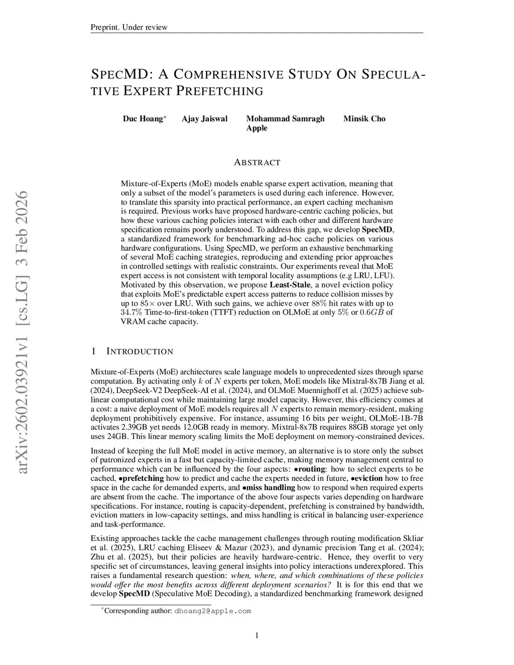 Mixture-of-Experts (MoE) models enable sparse expert activation, meaning that only a subset of the model's parameters is used during each inference. However, to translate this sparsity into practical performance, an expert caching mechanism is required. Previous works have proposed hardware-centric caching policies, but how these various caching policies interact with each other and different hardware specification remains poorly understood. To address this gap, we develop \textbf{SpecMD}, a standardized framework for benchmarking ad-hoc cache policies on various hardware configurations. Using SpecMD, we perform an exhaustive benchmarking of several MoE caching strategies, reproducing and extending prior approaches in controlled settings with realistic constraints. Our experiments reveal that MoE expert access is not consistent with temporal locality assumptions (e.g LRU, LFU). Motivated by this observation, we propose \textbf{Least-Stale}, a novel eviction policy that exploits MoE's predictable expert access patterns to reduce collision misses by up to over LRU. With such gains, we achieve over hit rates with up to Time-to-first-token (TTFT) reduction on OLMoE at only or of VRAM cache capacity.
