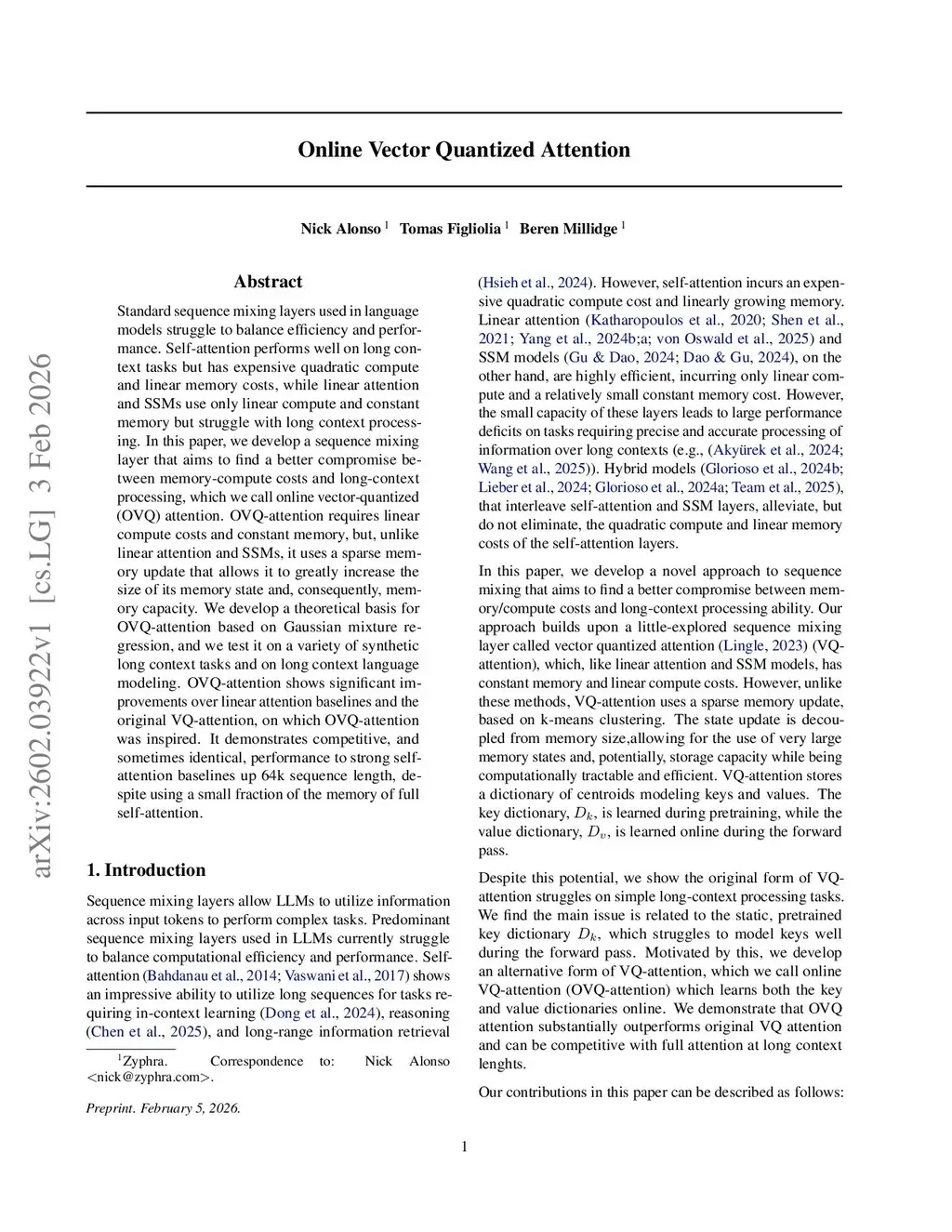 Standard sequence mixing layers used in language models struggle to balance efficiency and performance. Self-attention performs well on long context tasks but has expensive quadratic compute and linear memory costs, while linear attention and SSMs use only linear compute and constant memory but struggle with long context processing. In this paper, we develop a sequence mixing layer that aims to find a better compromise between memory-compute costs and long-context processing, which we call online vector-quantized (OVQ) attention. OVQ-attention requires linear compute costs and constant memory, but, unlike linear attention and SSMs, it uses a sparse memory update that allows it to greatly increase the size of its memory state and, consequently, memory capacity. We develop a theoretical basis for OVQ-attention based on Gaussian mixture regression, and we test it on a variety of synthetic long context tasks and on long context language modeling. OVQ-attention shows significant improvements over linear attention baselines and the original VQ-attention, on which OVQ-attention was inspired. It demonstrates competitive, and sometimes identical, performance to strong self-attention baselines up 64k sequence length, despite using a small fraction of the memory of full self-attention.