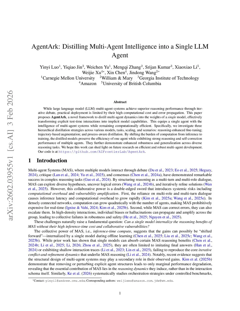 While large language model (LLM) multi-agent systems achieve superior reasoning performance through iterative debate, practical deployment is limited by their high computational cost and error propagation. This paper proposes AgentArk, a novel framework to distill multi-agent dynamics into the weights of a single model, effectively transforming explicit test-time interactions into implicit model capabilities. This equips a single agent with the intelligence of multi-agent systems while remaining computationally efficient. Specifically, we investigate three hierarchical distillation strategies across various models, tasks, scaling, and scenarios: reasoning-enhanced fine-tuning; trajectory-based augmentation; and process-aware distillation. By shifting the burden of computation from inference to training, the distilled models preserve the efficiency of one agent while exhibiting strong reasoning and self-correction performance of multiple agents. They further demonstrate enhanced robustness and generalization across diverse reasoning tasks. We hope this work can shed light on future research on efficient and robust multi-agent development. Our code is atthis https URL.