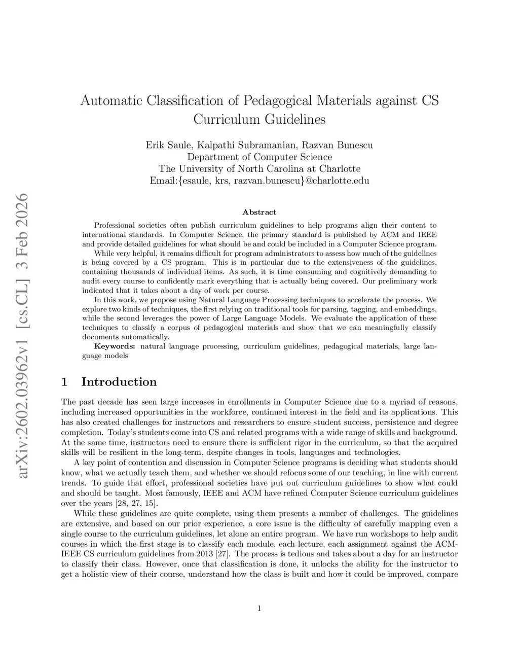 Professional societies often publish curriculum guidelines to help programs align their content to international standards. In Computer Science, the primary standard is published by ACM and IEEE and provide detailed guidelines for what should be and could be included in a Computer Science program.While very helpful, it remains difficult for program administrators to assess how much of the guidelines is being covered by a CS program. This is in particular due to the extensiveness of the guidelines, containing thousands of individual items. As such, it is time consuming and cognitively demanding to audit every course to confidently mark everything that is actually being covered. Our preliminary work indicated that it takes about a day of work per course.In this work, we propose using Natural Language Processing techniques to accelerate the process. We explore two kinds of techniques, the first relying on traditional tools for parsing, tagging, and embeddings, while the second leverages the power of Large Language Models. We evaluate the application of these techniques to classify a corpus of pedagogical materials and show that we can meaningfully classify documents automatically.