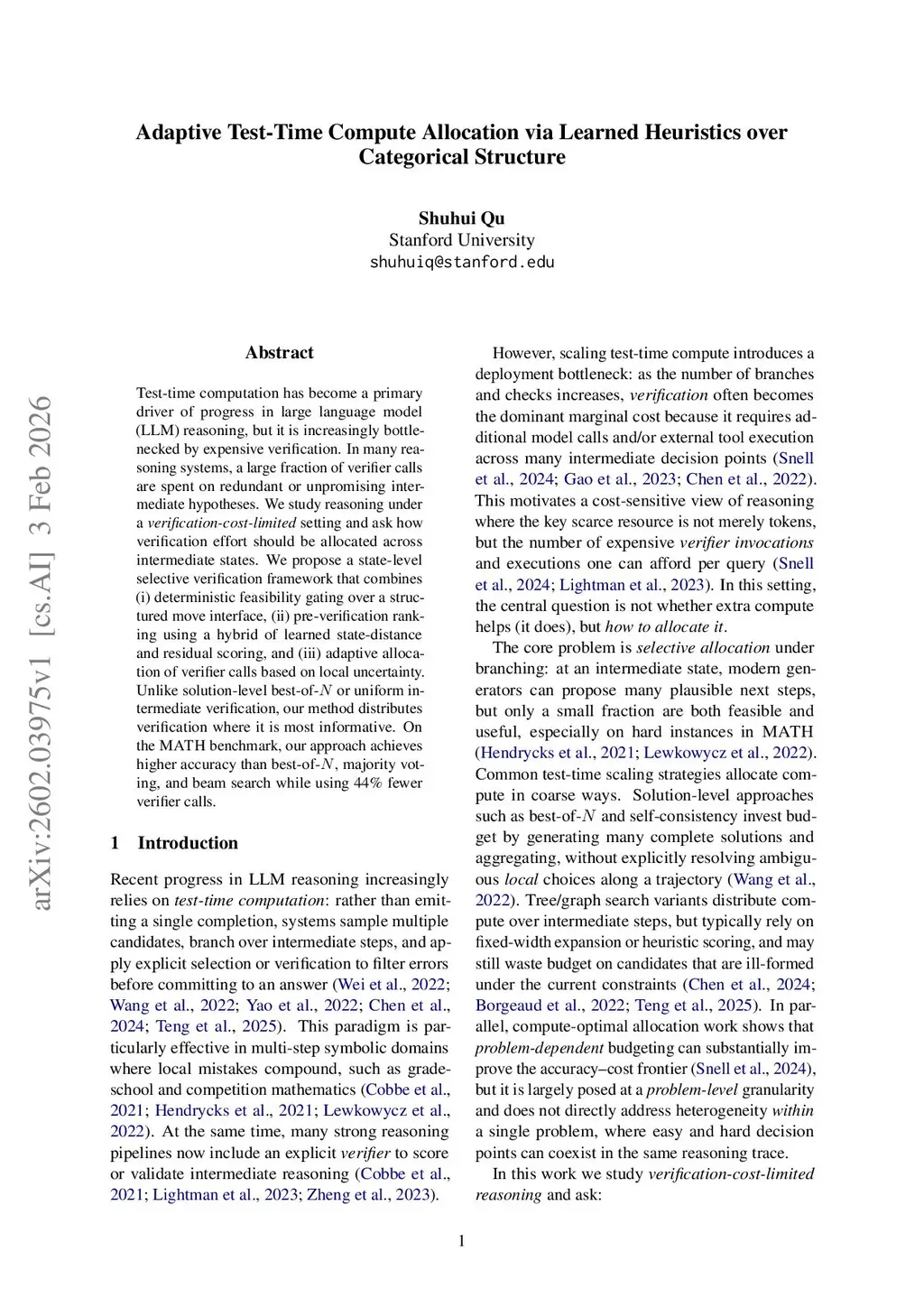 Test-time computation has become a primary driver of progress in large language model (LLM) reasoning, but it is increasingly bottlenecked by expensive verification. In many reasoning systems, a large fraction of verifier calls are spent on redundant or unpromising intermediate hypotheses. We study reasoning under a \emph{verification-cost-limited} setting and ask how verification effort should be allocated across intermediate states. We propose a state-level selective verification framework that combines (i) deterministic feasibility gating over a structured move interface, (ii) pre-verification ranking using a hybrid of learned state-distance and residual scoring, and (iii) adaptive allocation of verifier calls based on local uncertainty. Unlike solution-level best-of- or uniform intermediate verification, our method distributes verification where it is most informative. On the \textsc{MATH} benchmark, our approach achieves higher accuracy than best-of-, majority voting, and beam search while using 44\% fewer verifier calls.