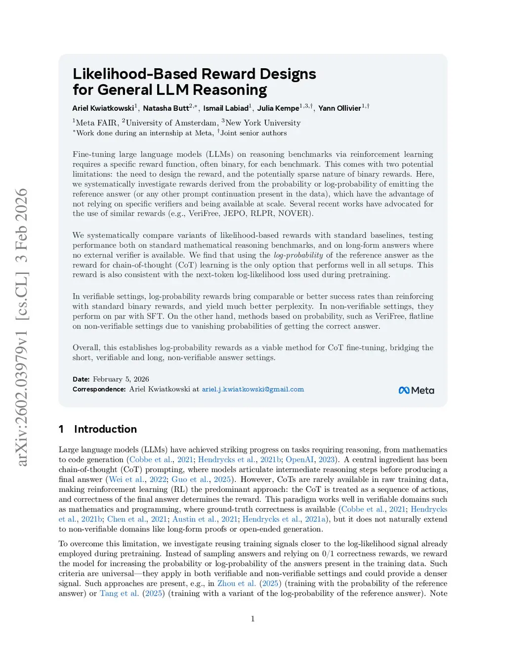 Likelihood-Based Reward Designs for General LLM Reasoning
