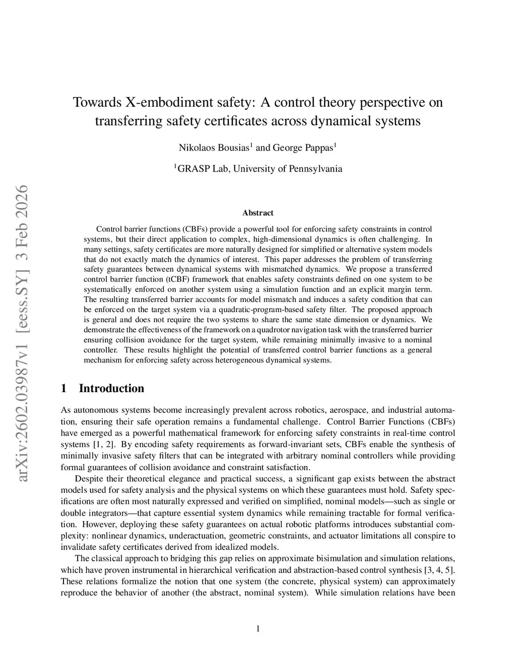 Control barrier functions (CBFs) provide a powerful tool for enforcing safety constraints in control systems, but their direct application to complex, high-dimensional dynamics is often challenging. In many settings, safety certificates are more naturally designed for simplified or alternative system models that do not exactly match the dynamics of interest. This paper addresses the problem of transferring safety guarantees between dynamical systems with mismatched dynamics. We propose a transferred control barrier function (tCBF) framework that enables safety constraints defined on one system to be systematically enforced on another system using a simulation function and an explicit margin term. The resulting transferred barrier accounts for model mismatch and induces a safety condition that can be enforced on the target system via a quadratic-program-based safety filter. The proposed approach is general and does not require the two systems to share the same state dimension or dynamics. We demonstrate the effectiveness of the framework on a quadrotor navigation task with the transferred barrier ensuring collision avoidance for the target system, while remaining minimally invasive to a nominal controller. These results highlight the potential of transferred control barrier functions as a general mechanism for enforcing safety across heterogeneous dynamical systems.