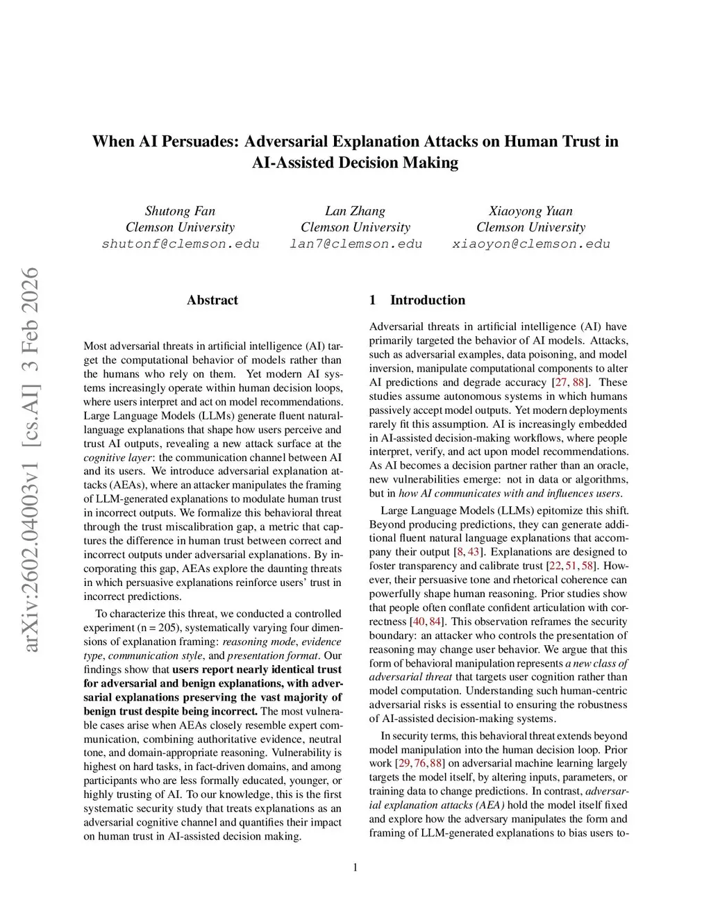 Most adversarial threats in artificial intelligence target the computational behavior of models rather than the humans who rely on them. Yet modern AI systems increasingly operate within human decision loops, where users interpret and act on model recommendations. Large Language Models generate fluent natural-language explanations that shape how users perceive and trust AI outputs, revealing a new attack surface at the cognitive layer: the communication channel between AI and its users. We introduce adversarial explanation attacks (AEAs), where an attacker manipulates the framing of LLM-generated explanations to modulate human trust in incorrect outputs. We formalize this behavioral threat through the trust miscalibration gap, a metric that captures the difference in human trust between correct and incorrect outputs under adversarial explanations. By incorporating this gap, AEAs explore the daunting threats in which persuasive explanations reinforce users' trust in incorrect predictions. To characterize this threat, we conducted a controlled experiment (n = 205), systematically varying four dimensions of explanation framing: reasoning mode, evidence type, communication style, and presentation format. Our findings show that users report nearly identical trust for adversarial and benign explanations, with adversarial explanations preserving the vast majority of benign trust despite being incorrect. The most vulnerable cases arise when AEAs closely resemble expert communication, combining authoritative evidence, neutral tone, and domain-appropriate reasoning. Vulnerability is highest on hard tasks, in fact-driven domains, and among participants who are less formally educated, younger, or highly trusting of AI. This is the first systematic security study that treats explanations as an adversarial cognitive channel and quantifies their impact on human trust in AI-assisted decision making.