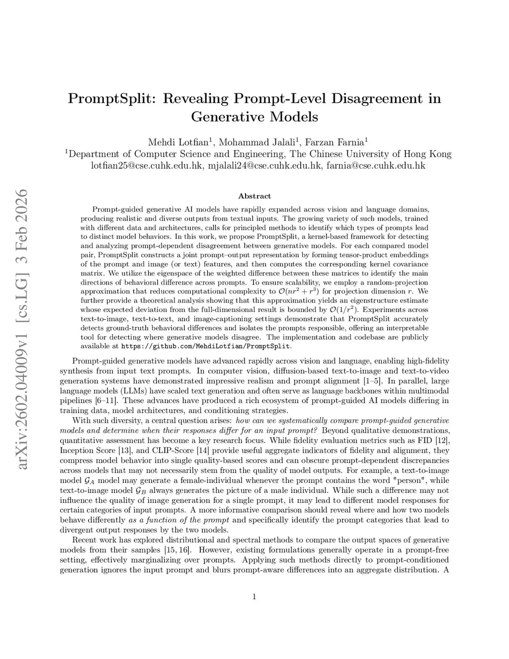 Prompt-guided generative AI models have rapidly expanded across vision and language domains, producing realistic and diverse outputs from textual inputs. The growing variety of such models, trained with different data and architectures, calls for principled methods to identify which types of prompts lead to distinct model behaviors. In this work, we propose PromptSplit, a kernel-based framework for detecting and analyzing prompt-dependent disagreement between generative models. For each compared model pair, PromptSplit constructs a joint prompt--output representation by forming tensor-product embeddings of the prompt and image (or text) features, and then computes the corresponding kernel covariance matrix. We utilize the eigenspace of the weighted difference between these matrices to identify the main directions of behavioral difference across prompts. To ensure scalability, we employ a random-projection approximation that reduces computational complexity to O(nr2+r3)O(nr^2 + r^3) for projection dimension rr. We further provide a theoretical analysis showing that this approximation yields an eigenstructure estimate whose expected deviation from the full-dimensional result is bounded by O(1/r2)O(1/r^2). Experiments across text-to-image, text-to-text, and image-captioning settings demonstrate that PromptSplit accurately detects ground-truth behavioral differences and isolates the prompts responsible, offering an interpretable tool for detecting where generative models disagree.