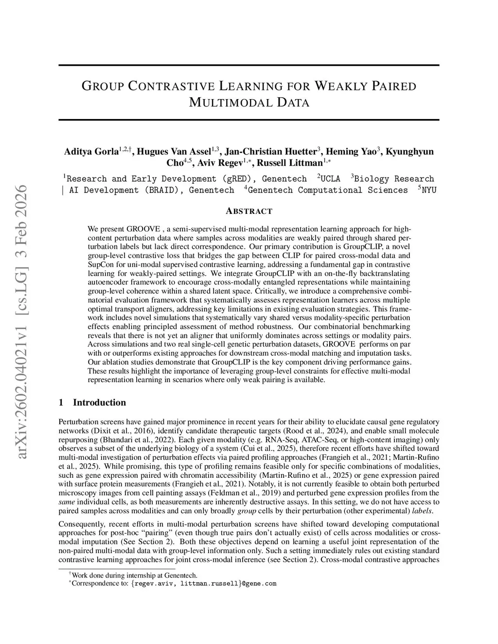 We present GROOVE, a semi-supervised multi-modal representation learning approach for high-content perturbation data where samples across modalities are weakly paired through shared perturbation labels but lack direct correspondence. Our primary contribution is GroupCLIP, a novel group-level contrastive loss that bridges the gap between CLIP for paired cross-modal data and SupCon for uni-modal supervised contrastive learning, addressing a fundamental gap in contrastive learning for weakly-paired settings. We integrate GroupCLIP with an on-the-fly backtranslating autoencoder framework to encourage cross-modally entangled representations while maintaining group-level coherence within a shared latent space. Critically, we introduce a comprehensive combinatorial evaluation framework that systematically assesses representation learners across multiple optimal transport aligners, addressing key limitations in existing evaluation strategies. This framework includes novel simulations that systematically vary shared versus modality-specific perturbation effects enabling principled assessment of method robustness. Our combinatorial benchmarking reveals that there is not yet an aligner that uniformly dominates across settings or modality pairs. Across simulations and two real single-cell genetic perturbation datasets, GROOVE performs on par with or outperforms existing approaches for downstream cross-modal matching and imputation tasks. Our ablation studies demonstrate that GroupCLIP is the key component driving performance gains. These results highlight the importance of leveraging group-level constraints for effective multi-modal representation learning in scenarios where only weak pairing is available.