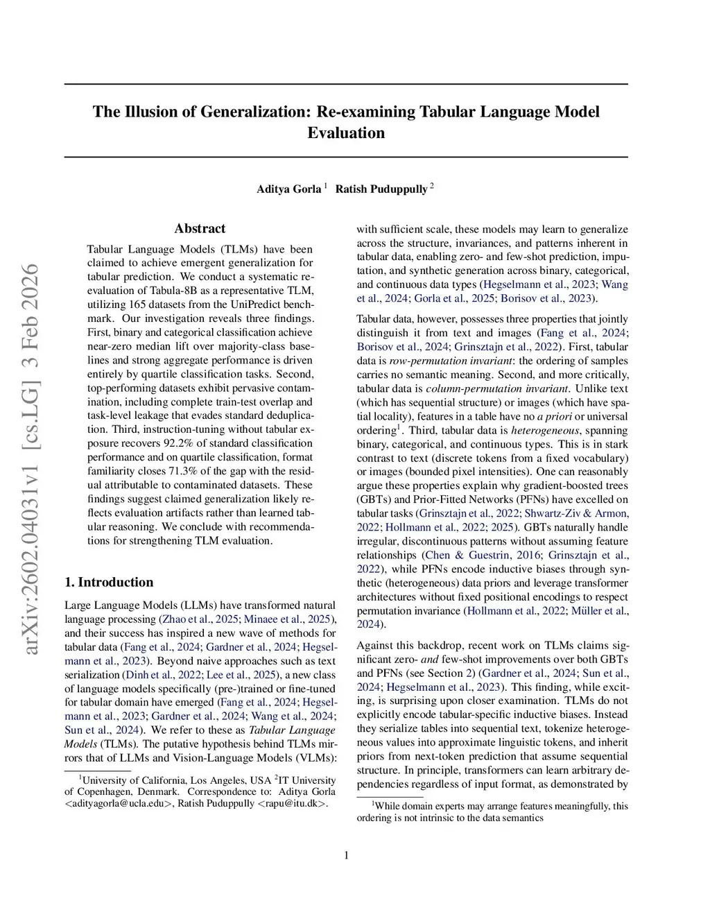 Tabular Language Models (TLMs) have been claimed to achieve emergent generalization for tabular prediction. We conduct a systematic re-evaluation of Tabula-8B as a representative TLM, utilizing 165 datasets from the UniPredict benchmark. Our investigation reveals three findings. First, binary and categorical classification achieve near-zero median lift over majority-class baselines and strong aggregate performance is driven entirely by quartile classification tasks. Second, top-performing datasets exhibit pervasive contamination, including complete train-test overlap and task-level leakage that evades standard deduplication. Third, instruction-tuning without tabular exposure recovers 92.2% of standard classification performance and on quartile classification, format familiarity closes 71.3% of the gap with the residual attributable to contaminated datasets. These findings suggest claimed generalization likely reflects evaluation artifacts rather than learned tabular reasoning. We conclude with recommendations for strengthening TLM evaluation.