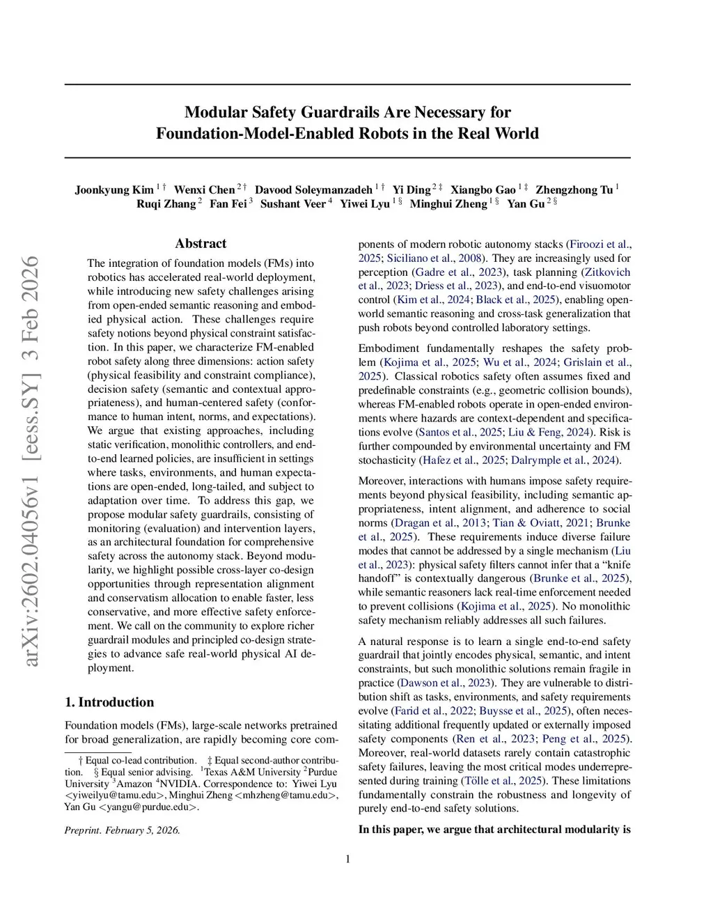 The integration of foundation models (FMs) into robotics has accelerated real-world deployment, while introducing new safety challenges arising from open-ended semantic reasoning and embodied physical action. These challenges require safety notions beyond physical constraint satisfaction. In this paper, we characterize FM-enabled robot safety along three dimensions: action safety (physical feasibility and constraint compliance), decision safety (semantic and contextual appropriateness), and human-centered safety (conformance to human intent, norms, and expectations). We argue that existing approaches, including static verification, monolithic controllers, and end-to-end learned policies, are insufficient in settings where tasks, environments, and human expectations are open-ended, long-tailed, and subject to adaptation over time. To address this gap, we propose modular safety guardrails, consisting of monitoring (evaluation) and intervention layers, as an architectural foundation for comprehensive safety across the autonomy stack. Beyond modularity, we highlight possible cross-layer co-design opportunities through representation alignment and conservatism allocation to enable faster, less conservative, and more effective safety enforcement. We call on the community to explore richer guardrail modules and principled co-design strategies to advance safe real-world physical AI deployment.