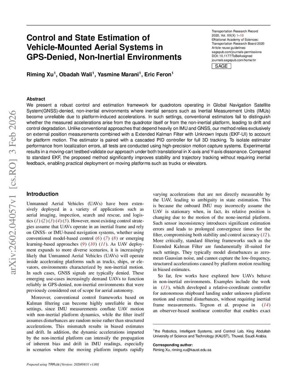 We present a robust control and estimation framework for quadrotors operating in Global Navigation Satellite System(GNSS)-denied, non-inertial environments where inertial sensors such as Inertial Measurement Units (IMUs) become unreliable due to platform-induced accelerations. In such settings, conventional estimators fail to distinguish whether the measured accelerations arise from the quadrotor itself or from the non-inertial platform, leading to drift and control degradation. Unlike conventional approaches that depend heavily on IMU and GNSS, our method relies exclusively on external position measurements combined with a Extended Kalman Filter with Unknown Inputs (EKF-UI) to account for platform motion. The estimator is paired with a cascaded PID controller for full 3D tracking. To isolate estimator performance from localization errors, all tests are conducted using high-precision motion capture systems. Experimental results in a moving-cart testbed validate our approach under both translational in X-axis and Y-axis dissonance. Compared to standard EKF, the proposed method significantly improves stability and trajectory tracking without requiring inertial feedback, enabling practical deployment on moving platforms such as trucks or elevators.