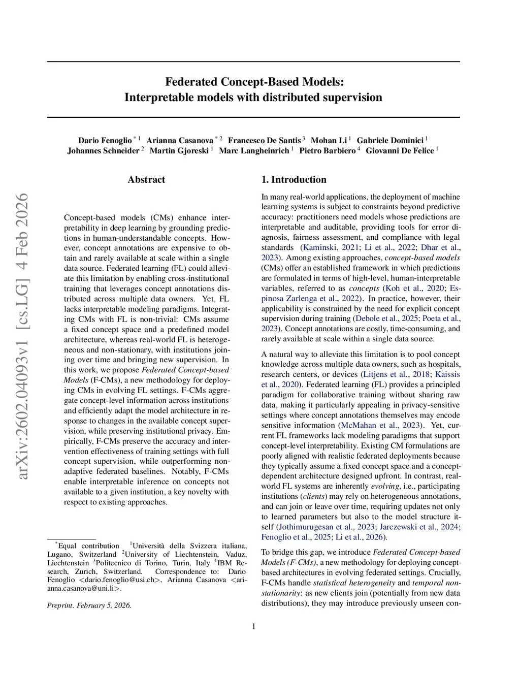 Concept-based models (CMs) enhance interpretability in deep learning by grounding predictions in human-understandable concepts. However, concept annotations are expensive to obtain and rarely available at scale within a single data source. Federated learning (FL) could alleviate this limitation by enabling cross-institutional training that leverages concept annotations distributed across multiple data owners. Yet, FL lacks interpretable modeling paradigms. Integrating CMs with FL is non-trivial: CMs assume a fixed concept space and a predefined model architecture, whereas real-world FL is heterogeneous and non-stationary, with institutions joining over time and bringing new supervision. In this work, we propose Federated Concept-based Models (F-CMs), a new methodology for deploying CMs in evolving FL settings. F-CMs aggregate concept-level information across institutions and efficiently adapt the model architecture in response to changes in the available concept supervision, while preserving institutional privacy. Empirically, F-CMs preserve the accuracy and intervention effectiveness of training settings with full concept supervision, while outperforming non-adaptive federated baselines. Notably, F-CMs enable interpretable inference on concepts not available to a given institution, a key novelty with respect to existing approaches.