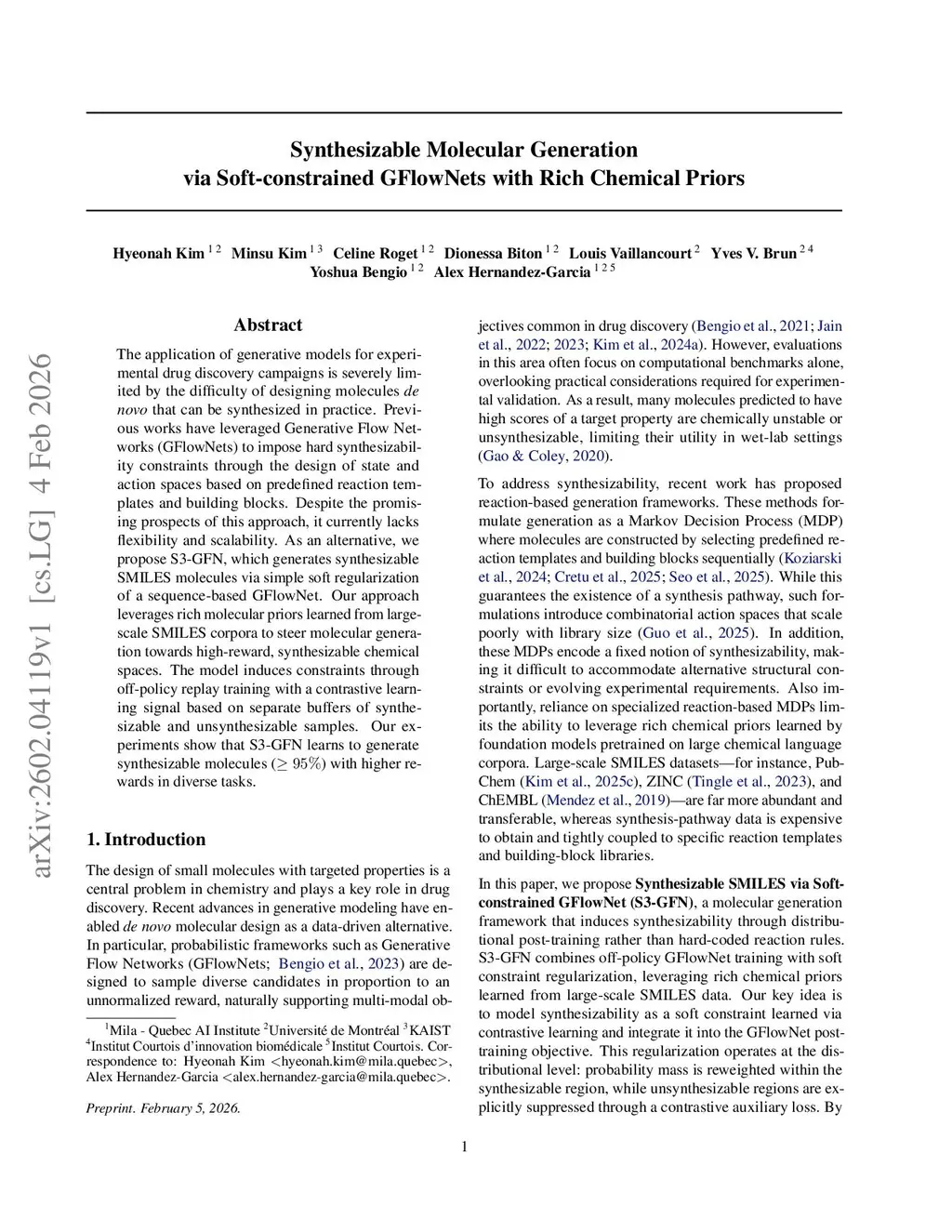 The application of generative models for experimental drug discovery campaigns is severely limited by the difficulty of designing molecules de novo that can be synthesized in practice. Previous works have leveraged Generative Flow Networks (GFlowNets) to impose hard synthesizability constraints through the design of state and action spaces based on predefined reaction templates and building blocks. Despite the promising prospects of this approach, it currently lacks flexibility and scalability. As an alternative, we propose S3-GFN, which generates synthesizable SMILES molecules via simple soft regularization of a sequence-based GFlowNet. Our approach leverages rich molecular priors learned from large-scale SMILES corpora to steer molecular generation towards high-reward, synthesizable chemical spaces. The model induces constraints through off-policy replay training with a contrastive learning signal based on separate buffers of synthesizable and unsynthesizable samples. Our experiments show that S3-GFN learns to generate synthesizable molecules () with higher rewards in diverse tasks.