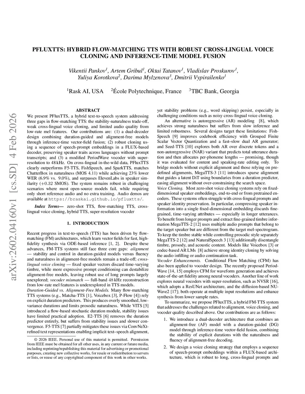 We present PFluxTTS, a hybrid text-to-speech system addressing three gaps in flow-matching TTS: the stability-naturalness trade-off, weak cross-lingual voice cloning, and limited audio quality from low-rate mel features. Our contributions are: (1) a dual-decoder design combining duration-guided and alignment-free models through inference-time vector-field fusion; (2) robust cloning using a sequence of speech-prompt embeddings in a FLUX-based decoder, preserving speaker traits across languages without prompt transcripts; and (3) a modified PeriodWave vocoder with super-resolution to 48 kHz. On cross-lingual in-the-wild data, PFluxTTS clearly outperforms F5-TTS, FishSpeech, and SparkTTS, matches ChatterBox in naturalness (MOS 4.11) while achieving 23% lower WER (6.9% vs. 9.0%), and surpasses ElevenLabs in speaker similarity (+0.32 SMOS). The system remains robust in challenging scenarios where most open-source models fail, while requiring only short reference audio and no extra training. Audio demos are available atthis https URL