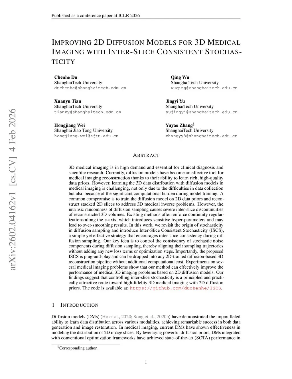 3D medical imaging is in high demand and essential for clinical diagnosis and scientific research. Currently, diffusion models (DMs) have become an effective tool for medical imaging reconstruction thanks to their ability to learn rich, high-quality data priors. However, learning the 3D data distribution with DMs in medical imaging is challenging, not only due to the difficulties in data collection but also because of the significant computational burden during model training. A common compromise is to train the DMs on 2D data priors and reconstruct stacked 2D slices to address 3D medical inverse problems. However, the intrinsic randomness of diffusion sampling causes severe inter-slice discontinuities of reconstructed 3D volumes. Existing methods often enforce continuity regularizations along the z-axis, which introduces sensitive hyper-parameters and may lead to over-smoothing results. In this work, we revisit the origin of stochasticity in diffusion sampling and introduce Inter-Slice Consistent Stochasticity (ISCS), a simple yet effective strategy that encourages interslice consistency during diffusion sampling. Our key idea is to control the consistency of stochastic noise components during diffusion sampling, thereby aligning their sampling trajectories without adding any new loss terms or optimization steps. Importantly, the proposed ISCS is plug-and-play and can be dropped into any 2D trained diffusion based 3D reconstruction pipeline without additional computational cost. Experiments on several medical imaging problems show that our method can effectively improve the performance of medical 3D imaging problems based on 2D diffusion models. Our findings suggest that controlling inter-slice stochasticity is a principled and practically attractive route toward high-fidelity 3D medical imaging with 2D diffusion priors. The code is available at:this https URL