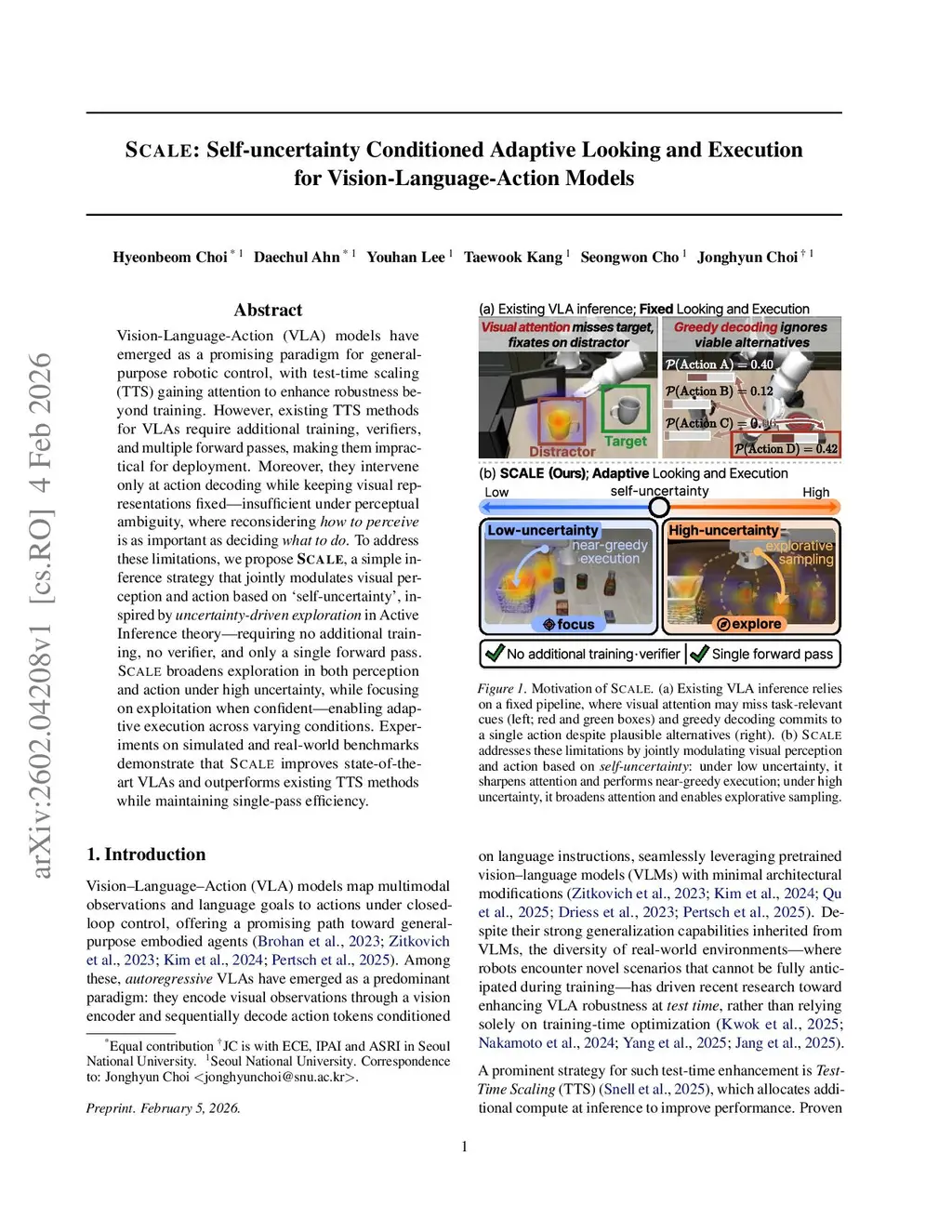 Vision-Language-Action (VLA) models have emerged as a promising paradigm for general-purpose robotic control, with test-time scaling (TTS) gaining attention to enhance robustness beyond training. However, existing TTS methods for VLAs require additional training, verifiers, and multiple forward passes, making them impractical for deployment. Moreover, they intervene only at action decoding while keeping visual representations fixed-insufficient under perceptual ambiguity, where reconsidering how to perceive is as important as deciding what to do. To address these limitations, we propose SCALE, a simple inference strategy that jointly modulates visual perception and action based on 'self-uncertainty', inspired by uncertainty-driven exploration in Active Inference theory-requiring no additional training, no verifier, and only a single forward pass. SCALE broadens exploration in both perception and action under high uncertainty, while focusing on exploitation when confident-enabling adaptive execution across varying conditions. Experiments on simulated and real-world benchmarks demonstrate that SCALE improves state-of-the-art VLAs and outperforms existing TTS methods while maintaining single-pass efficiency.