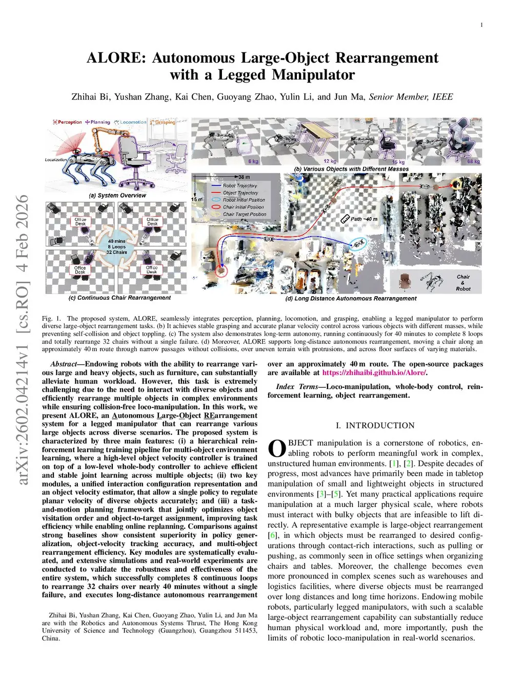 ALORE: Autonomous Large-Object Rearrangement with a Legged Manipulator
